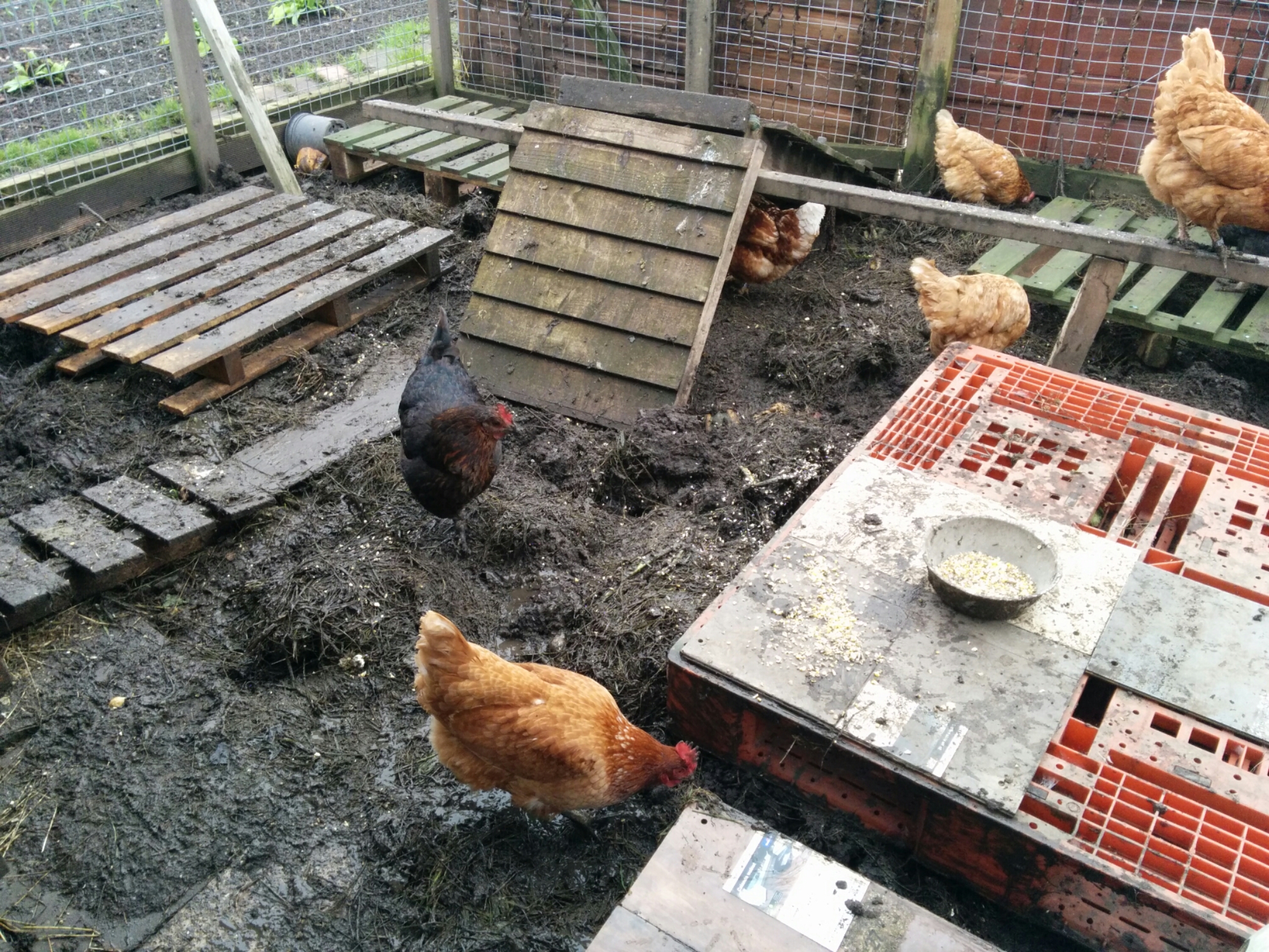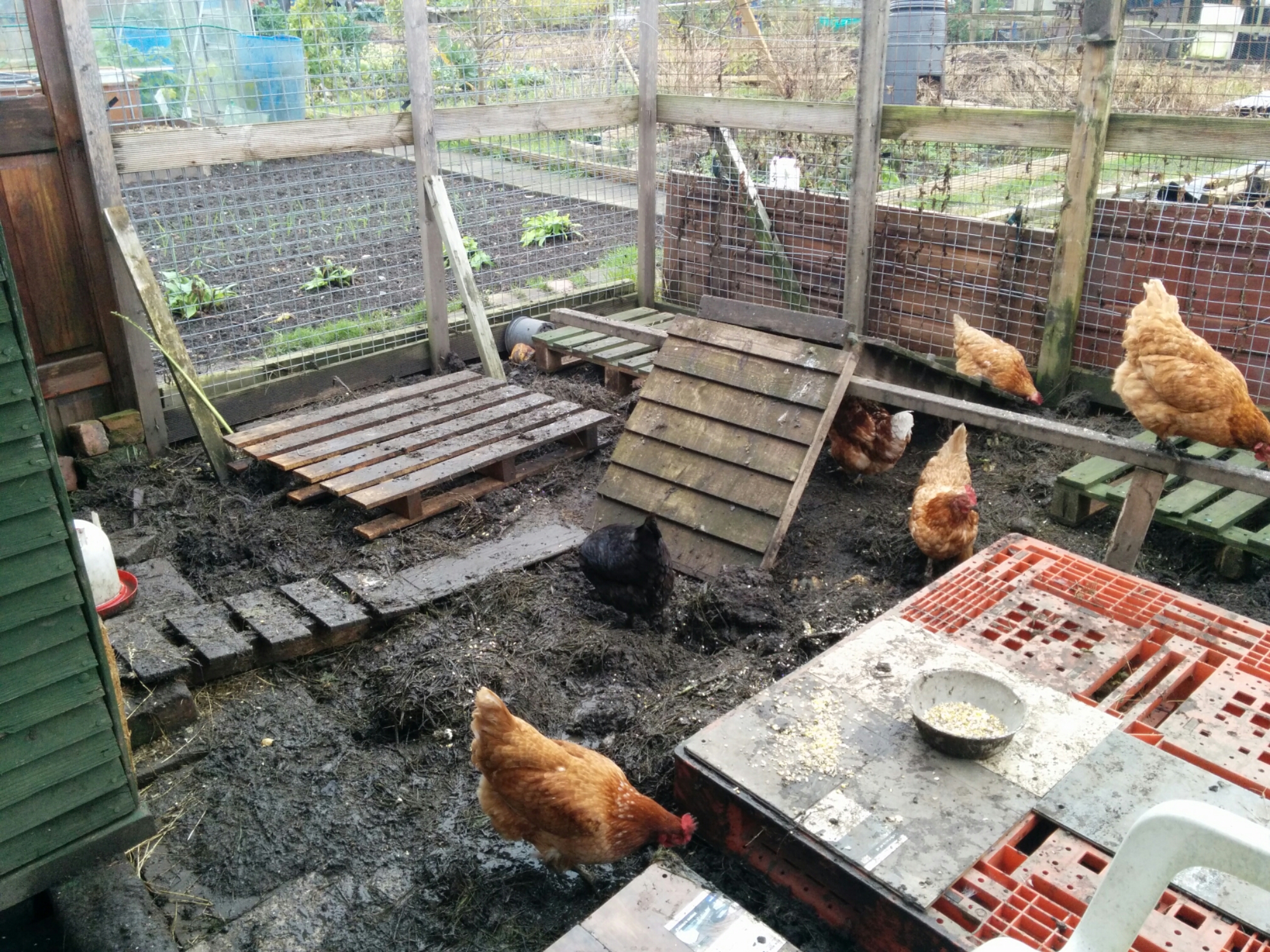 Whilst I was debating about how on earth I could fond enough green vegetation to get them off the mud, I noticed that the shed on the new plot had gone! Finally! Cliff came by and suggested the plastic and wooden crates that formed the floor of the decrepit shed would be ideal for keeping the chickens off the mud. I lugged several of them across and placed them around the coop so they could get all over it but without being in the mud.