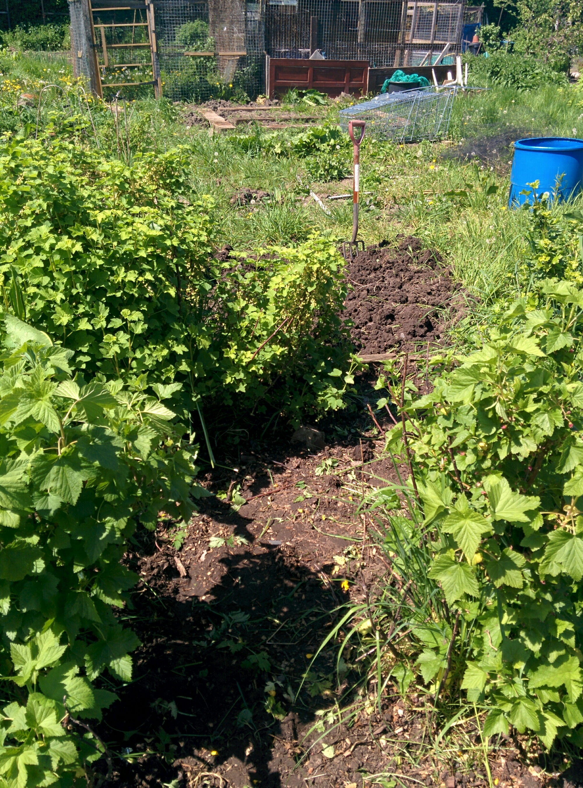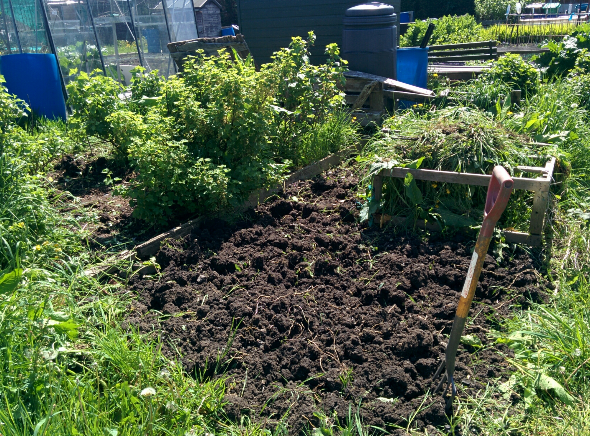 Whilst the husband ran to the shop with the pram in the hope it would get the increasingly grumpy baby to sleep, I tackled the berry bed. In a fairly short time, I managed to excavate some of the raspberry bushes and the blackberry bush from knee high grass tufts and never ending bind weed.