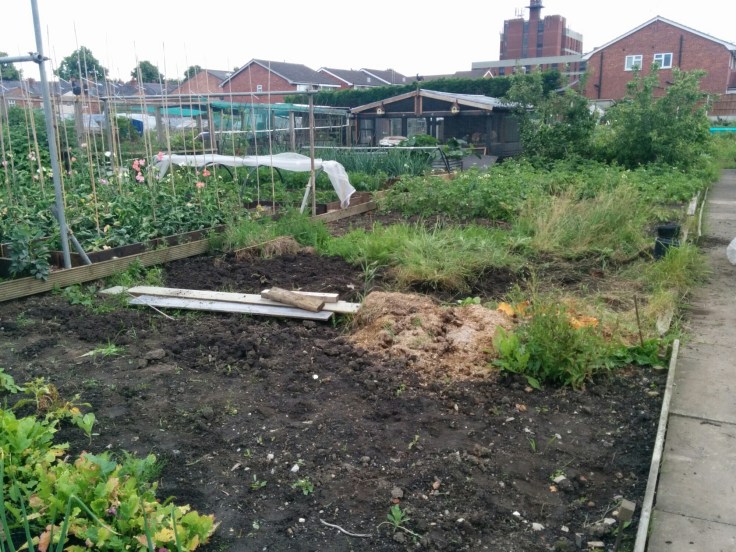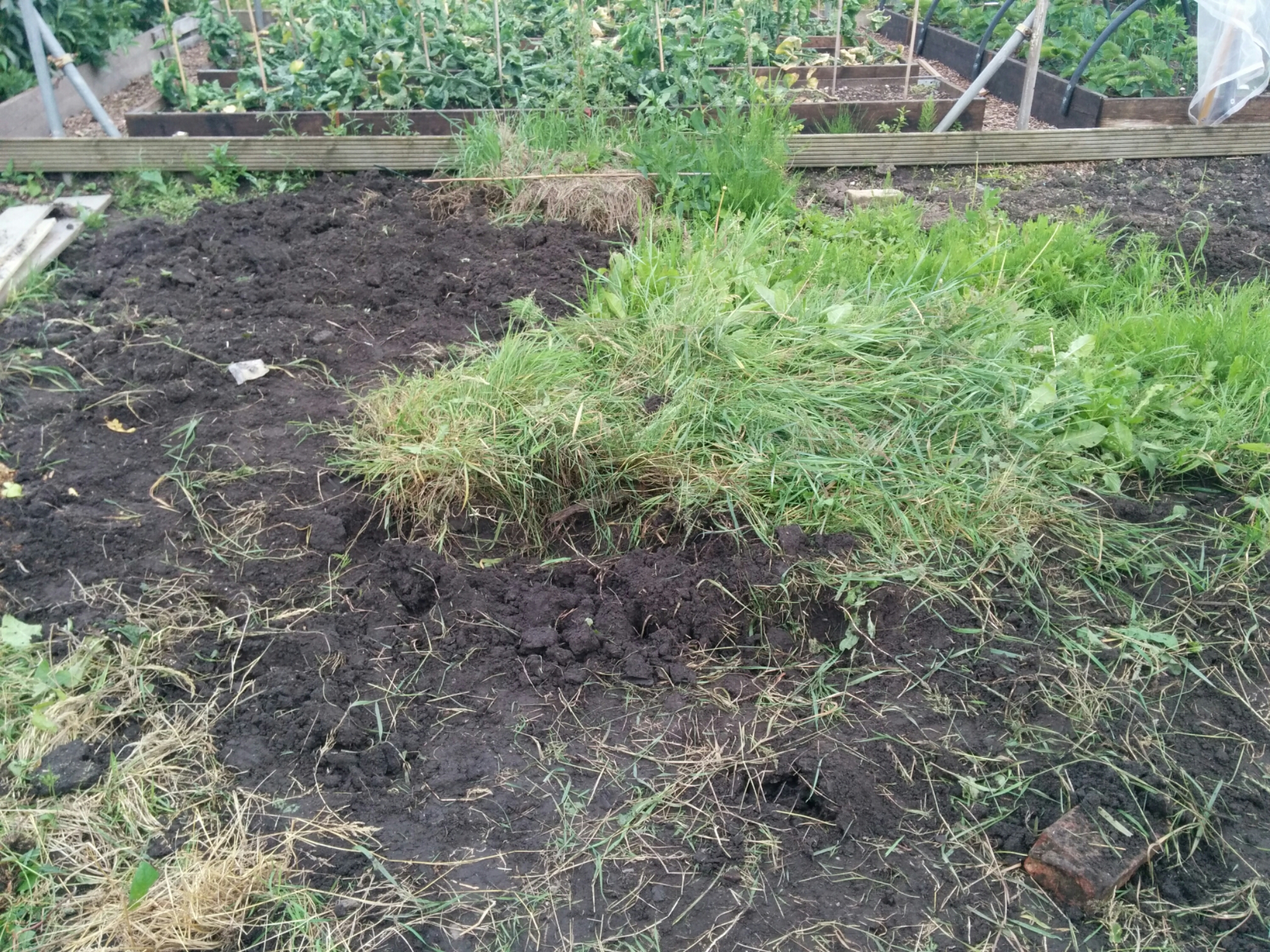 One magic moment after nearly 2 hours, we joined two cleared bits of land, previously covered, caked or even coated with at least 5 different types of grass, dandelions and a range of other weeds. It was a glorious moment. We marked it by heaving the third wheelbarrow load to the compost heap on the bottom plot.