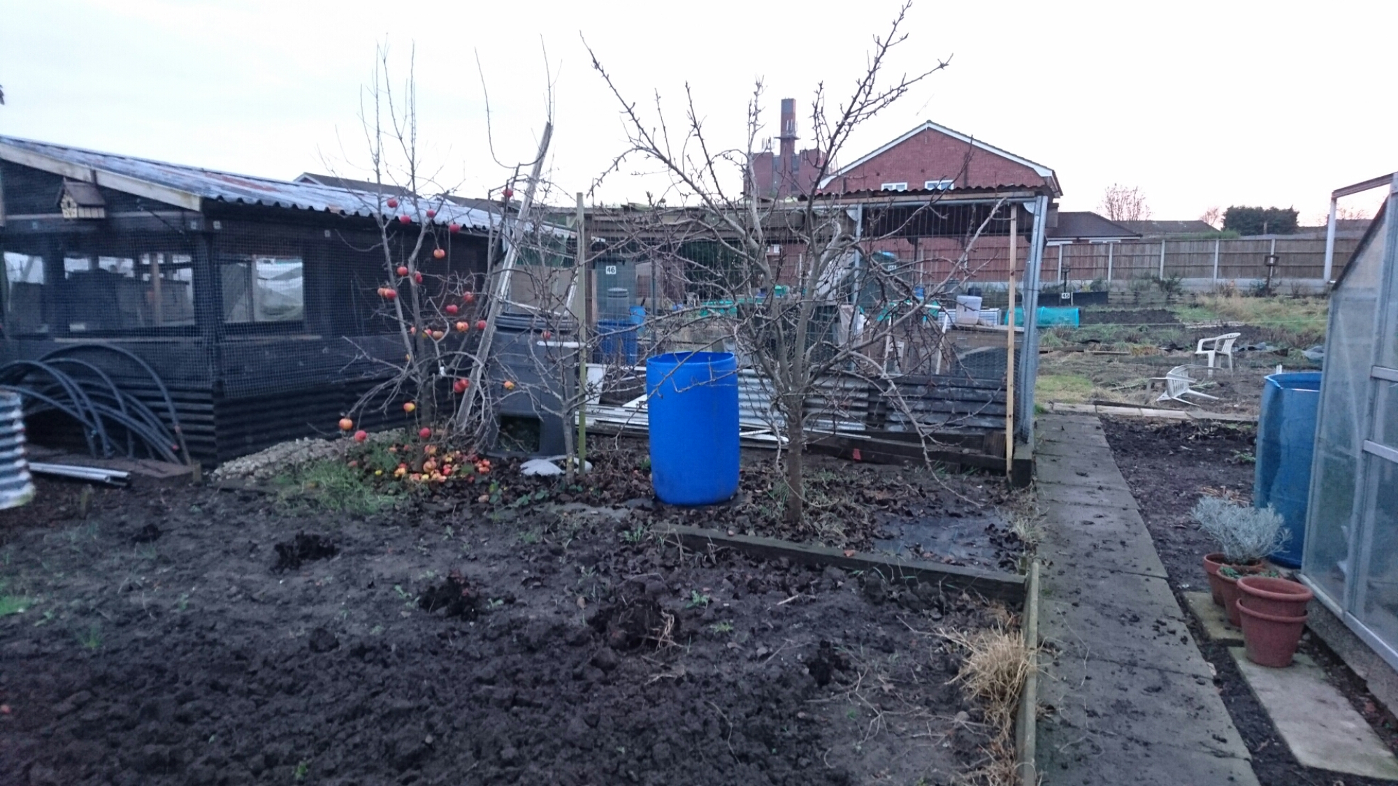 On our plot, my husband set off at a rate of knots, clearing a large section in front of the shed. I moved the frame of our large greenhouse next to the new coop as well as tidying the spare wood away to clear more space. The relocated compost bin has begun to be filled with old apples and buckets of weeds to make a rich compost for next year.