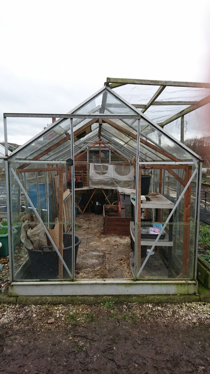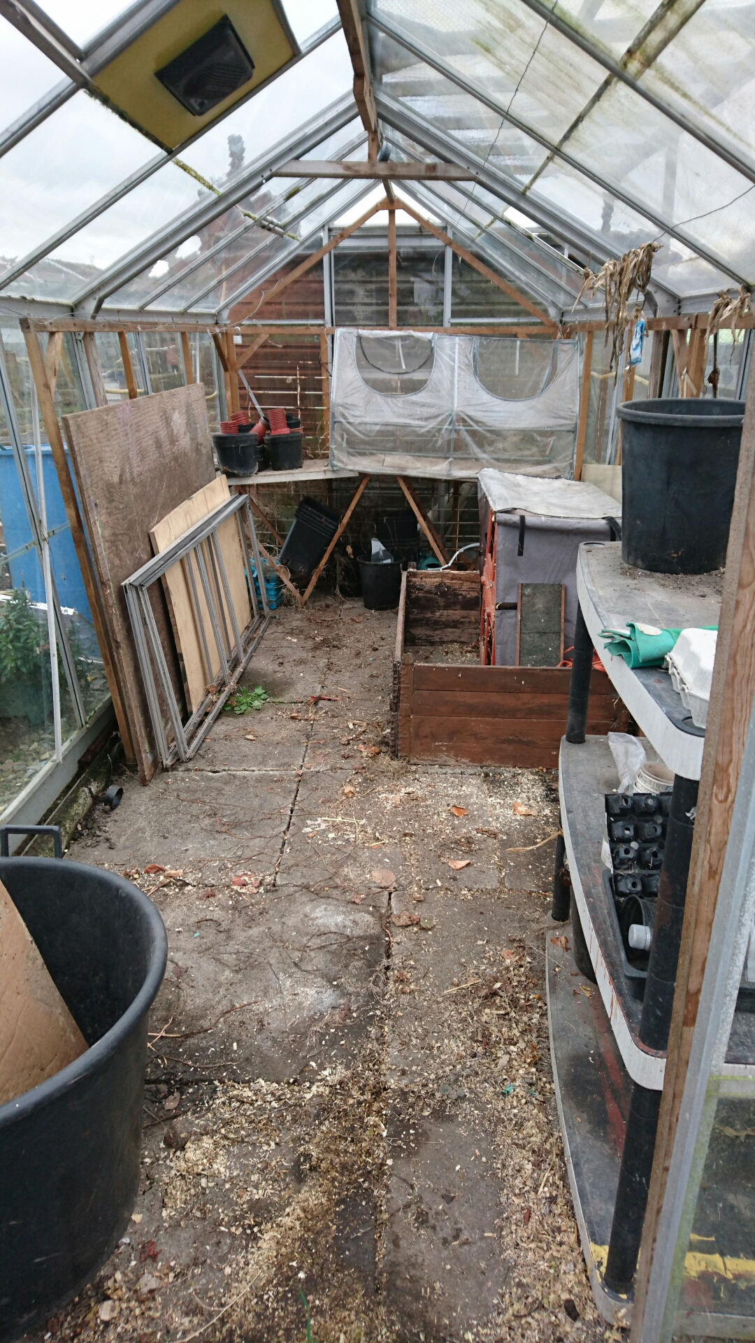 Whilst he battled on, I started to clear the greenhouse. It is massively overdue for a clean and tidy, but now at least you can walk into it. We have to replace a pane of glass in the roof of the greenhouse and the entirety of the door (which also needs putting back on!