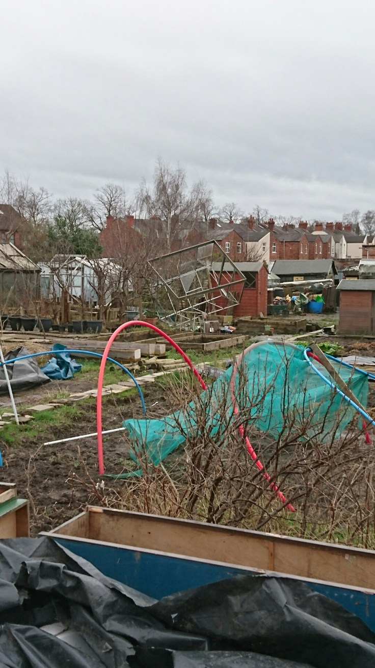Today we saw the damage from Storm Doris on site – upturned water butts and even a greenhouse!