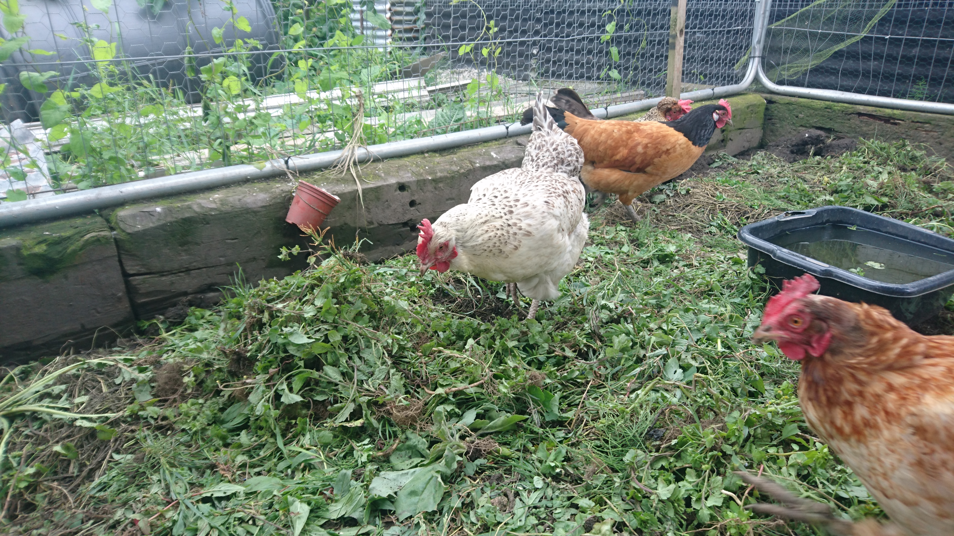 The chickens were happy to see us (or pretended to in order to get food) and they are back to laying in the small nest box. They are being spoilt with greenery as not only are we putting weeds in for them but at least three others are too!
