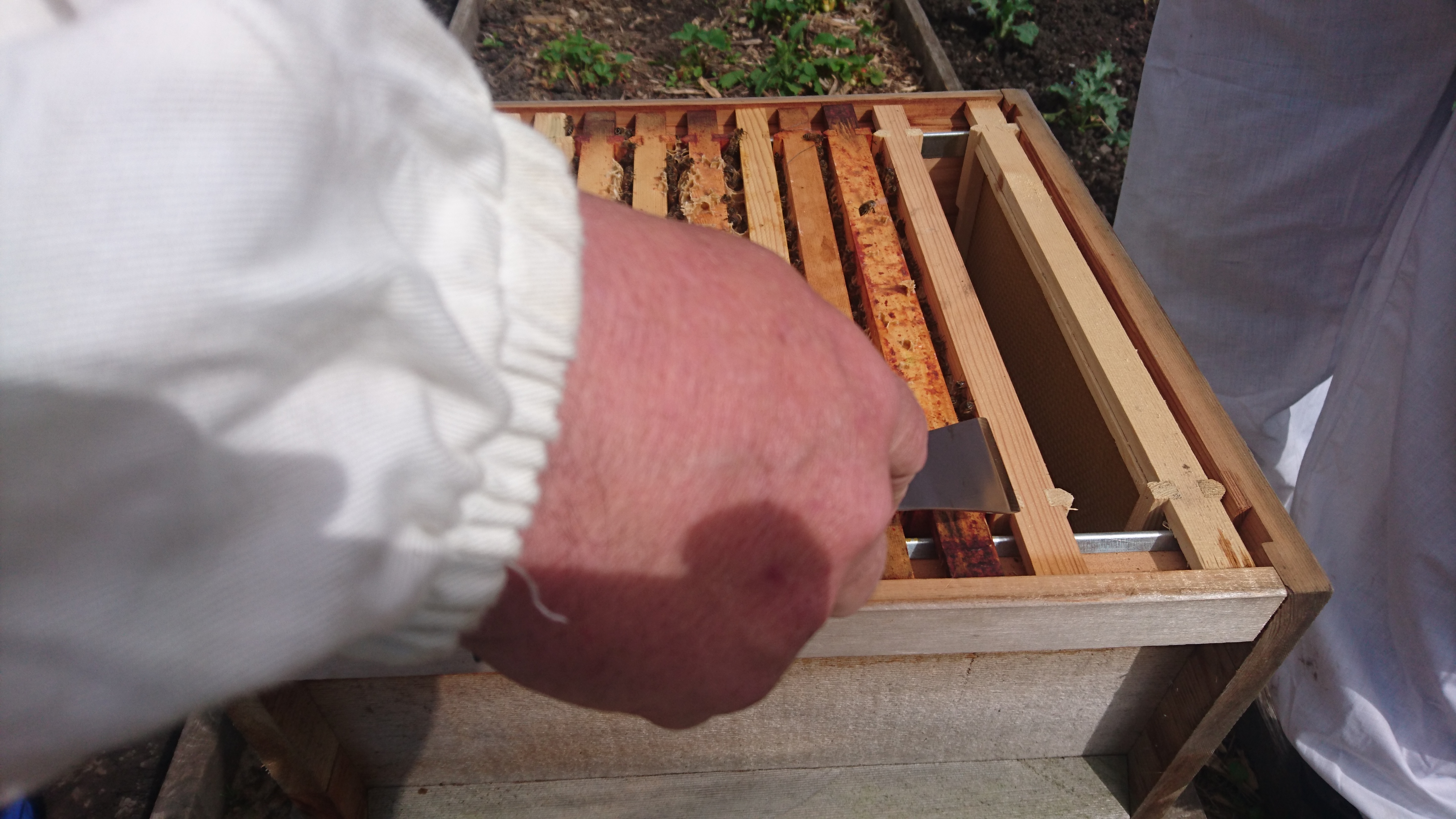 Being a Sunday, it meant the hive inspection! We watched Steve and Phil check the hives. The bees were rather more feisty this inspection than last week apparently due to the wind. Like my cat, the wind is an invisible enemy who tortures them when they go outside. The bees have been extremely busy in the last week. Even the smaller hive has significantly grown!