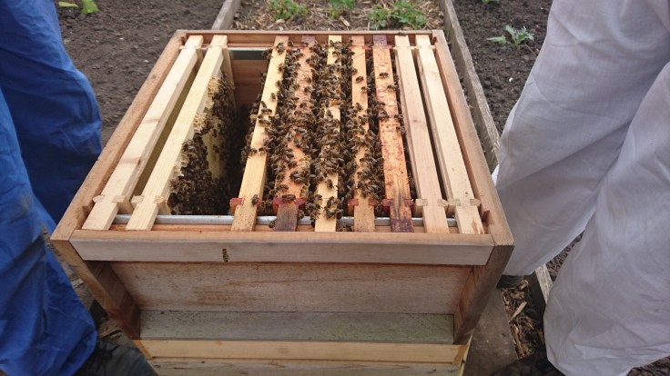 I was on secretary duty to record how the hive was working. Carefully, Steve dismantled the hive, checking for brood frames (new eggs and larvae kept here!). There were significantly more than last week, with the smaller hive comfortably doubling in size in the last week.