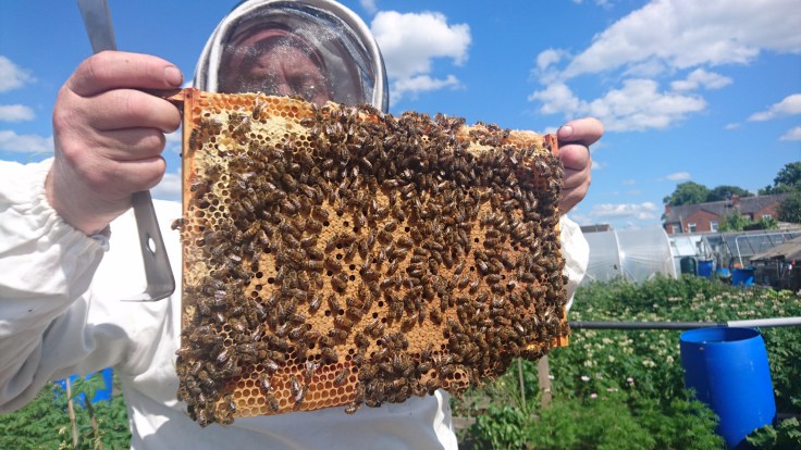 The hive on Phil’s plot is working on the first super box and filling in with honey! Steve is hoping they will fill another 2 supers so that we can harvest a full super (containing 12 frames of honey), leaving two full ones for the bees to eat over the winter. Steve reckons that one full super of honey could have 70lbs of honey in!