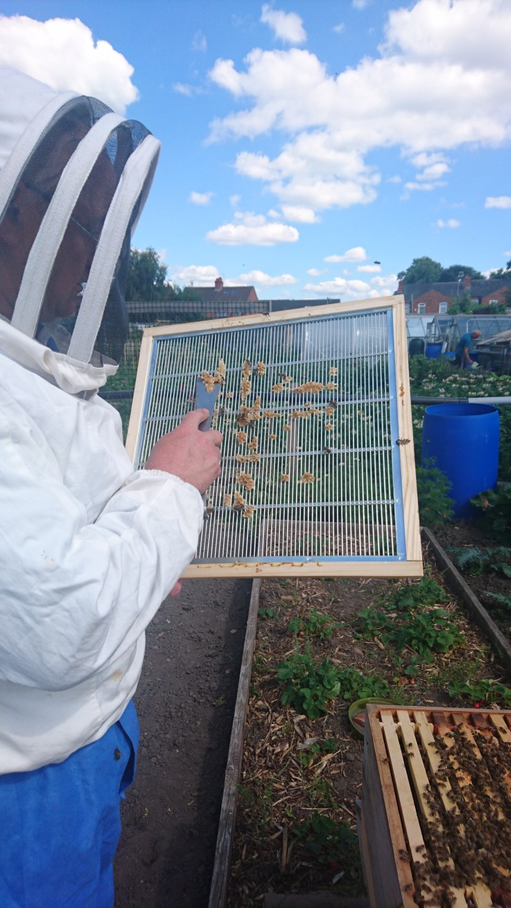 The bees are so busy building comb to fill with honey they have even built onto the Queen excluder! Steve had to scrape it off to clear the excluder – the scrap comb was put into a bucket and removed from the vicinity of the hive.