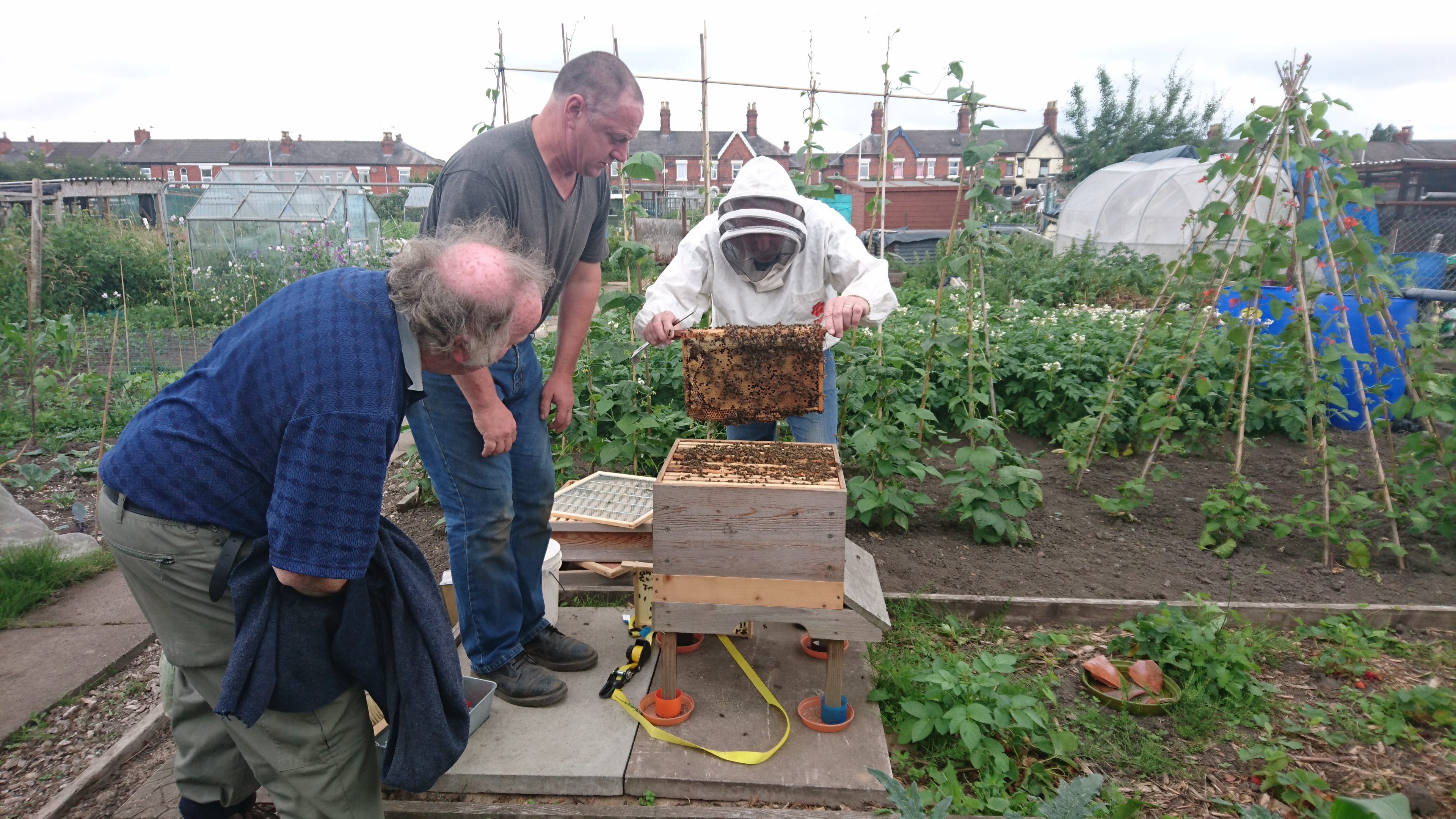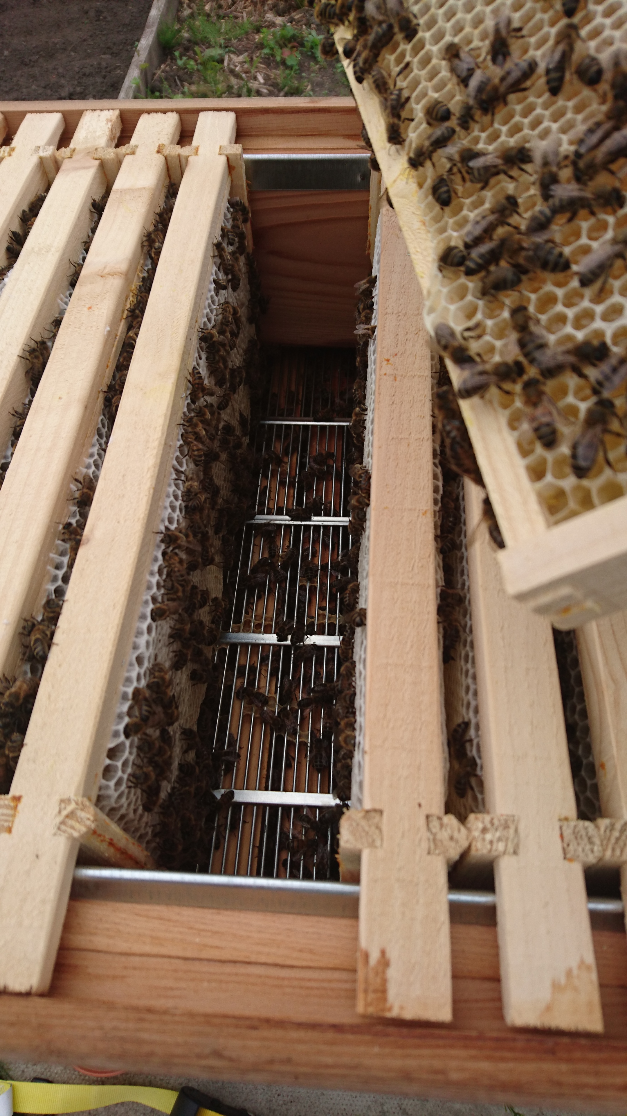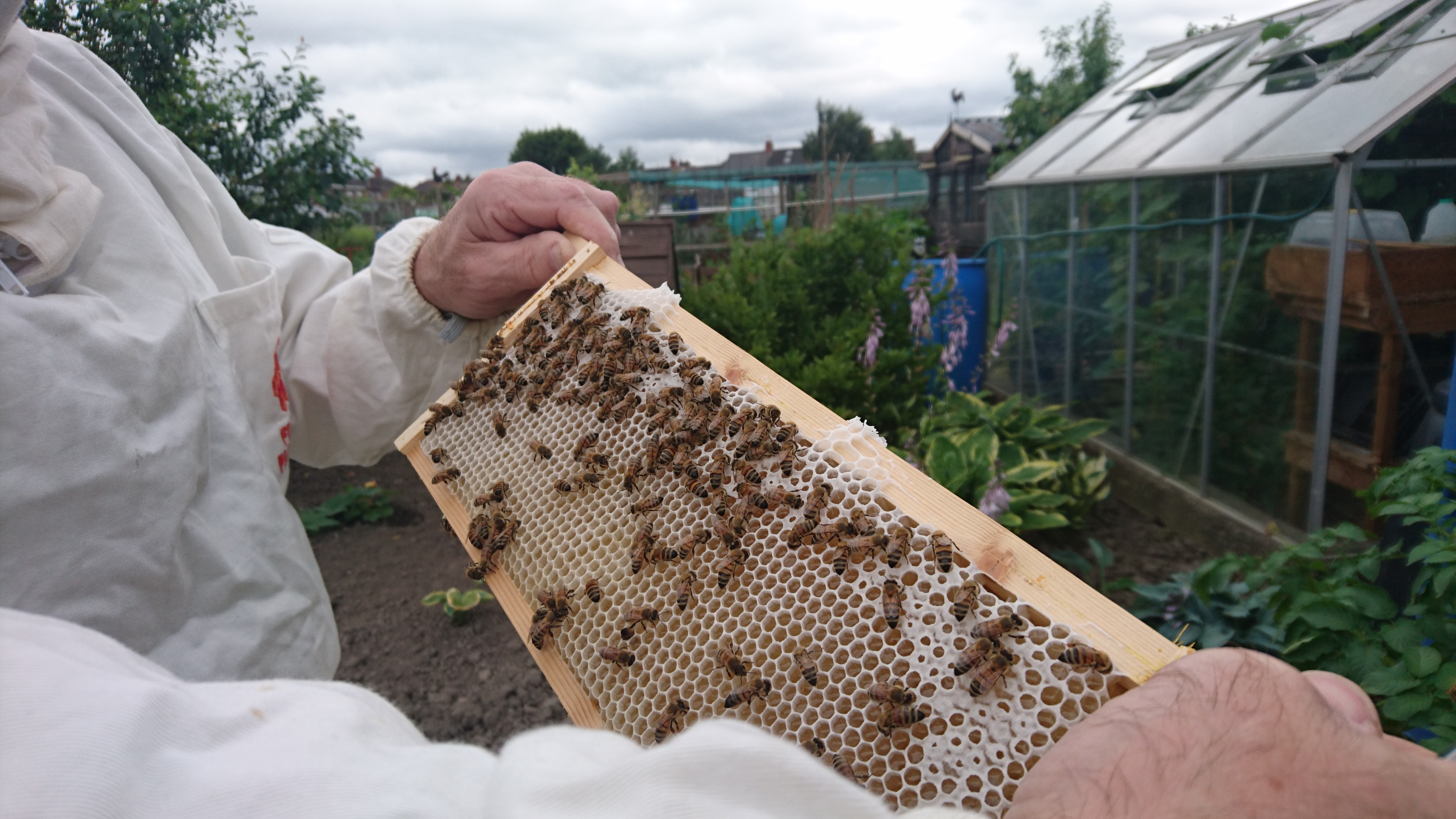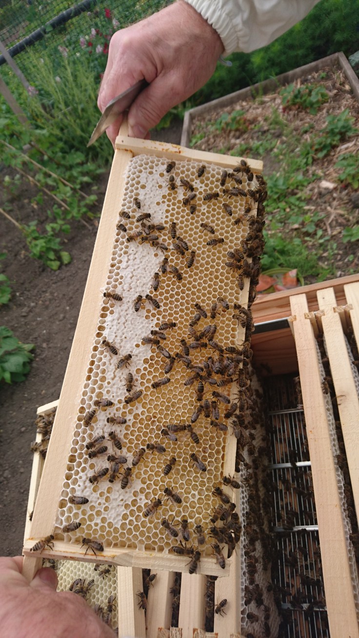 Hive 1 on Phil’s plot has been massively productive, with more honey frames filled this week. Soon it will need a new super (with 12 new frames) to keep them busy and at a lower risk of swarming.