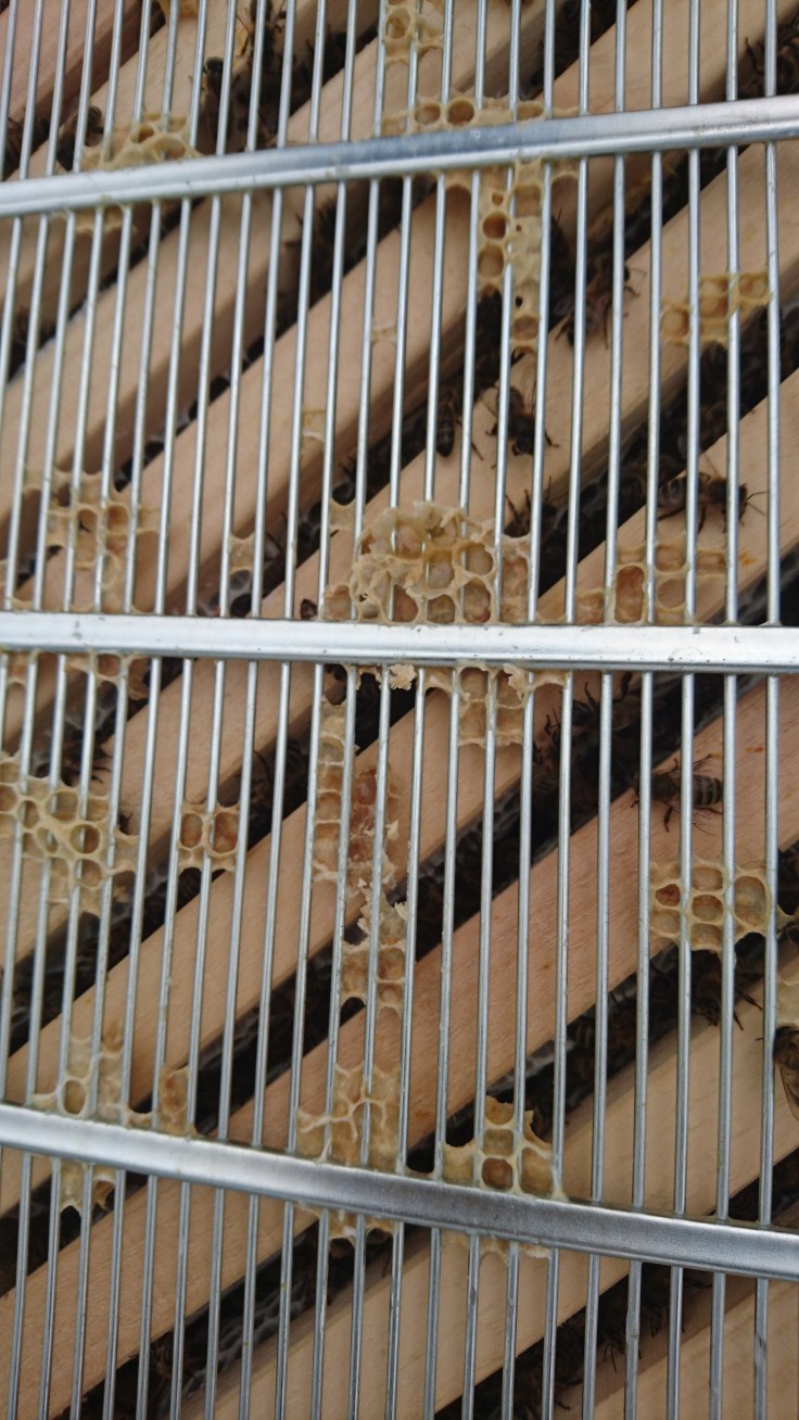 The brood box is busy, full of frames of eggs and larvae of worker bees and drones. I spotted the Queen today – she is significantly longer than the others and is usually surrounded by lots of worker bees.