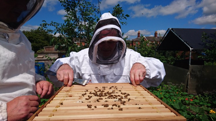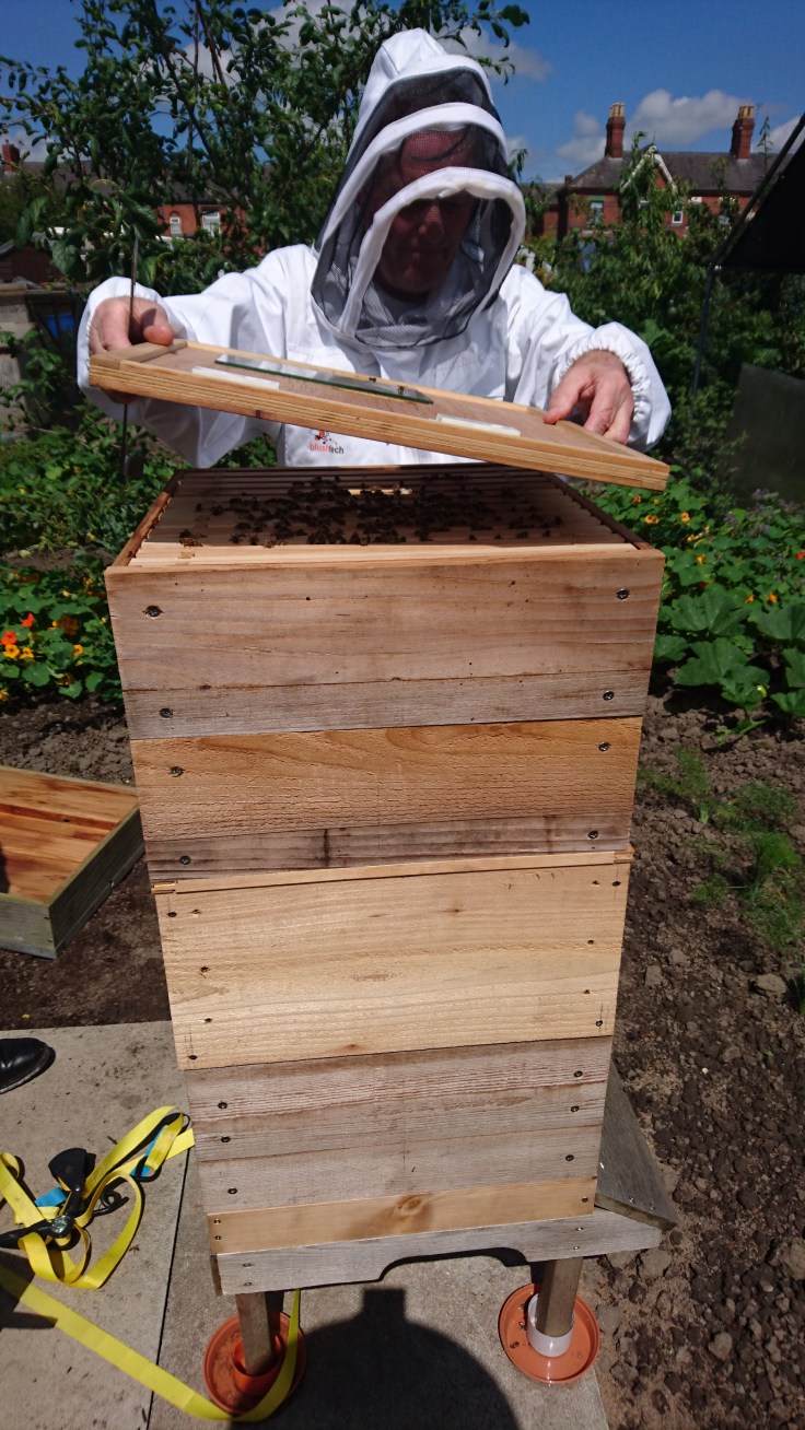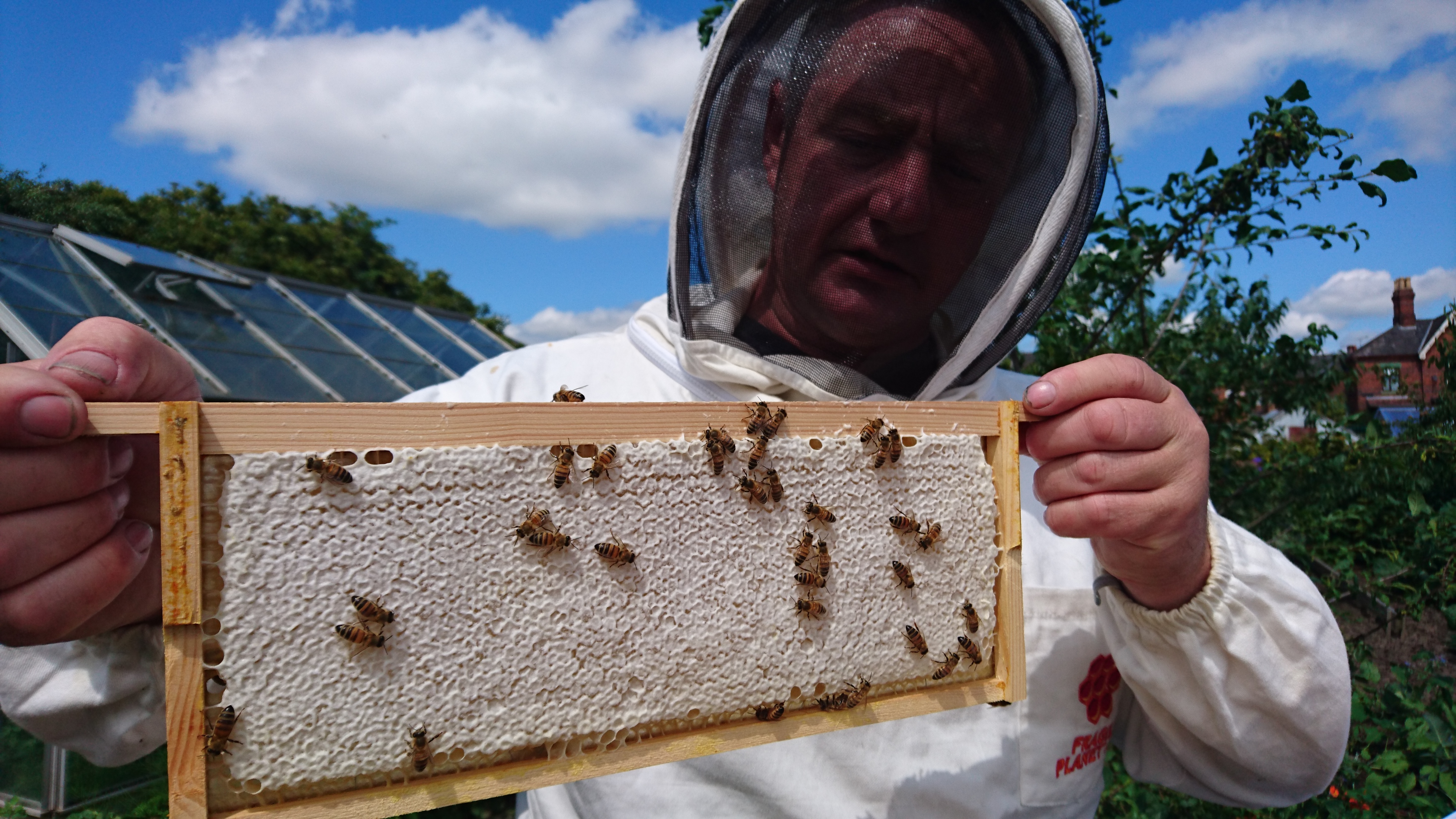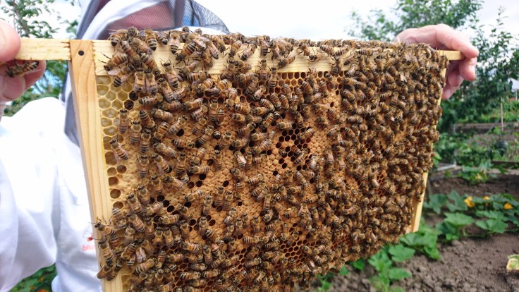 Well, not all of it but I was in full Bee keeping suit and was in charge of checking the brood box of the hive on plot 49 (the feisty colony). It was really interesting to do as I could see so much more when doing it myself. Things like spotting larva hidden in the hexagonal comb was nearly impossible to do when someone else was holding the frame.