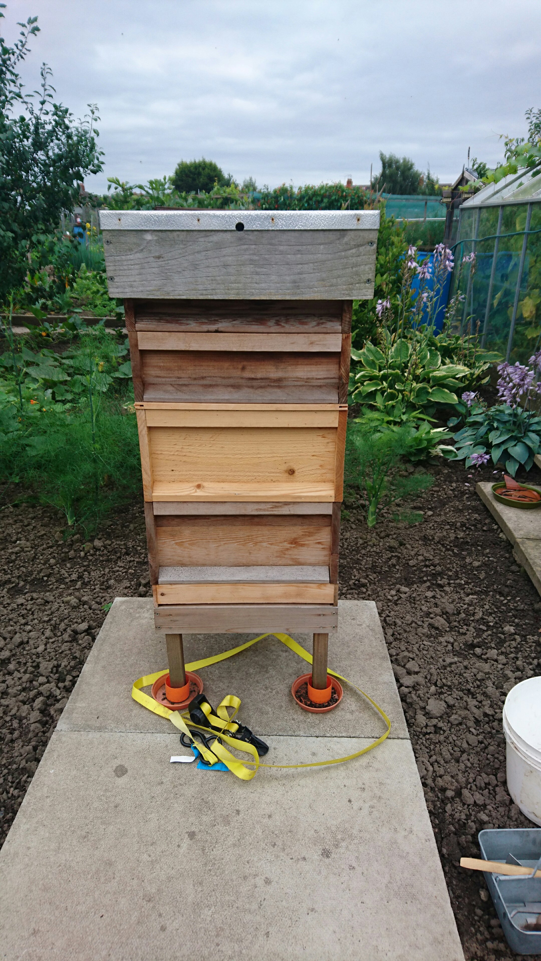 Steve and Phil arrived in the early afternoon to complete the weekly hive check. For some reason the hives weren’t checked last week so it was vitally important that a thorough check was done. We started with thepre temperamental hive on Phil’s half plot – the wind got up and the bees were not happy about it! Three stings for Phil and one for Steve later, the inspection was complete. As always we couldn’t find the Queen but we did find evidence of brood so she has clearly been there in the last 3 days. Steve reckons we will have to paint her as she is almost impossible to spot. More worryingly, several of the bees in the hive have deformed wings – it might be a sign of the dreaded Verrona mite which blights colonies and is most prevalent in August. Phil is calling their bee mentor to ask about it.
