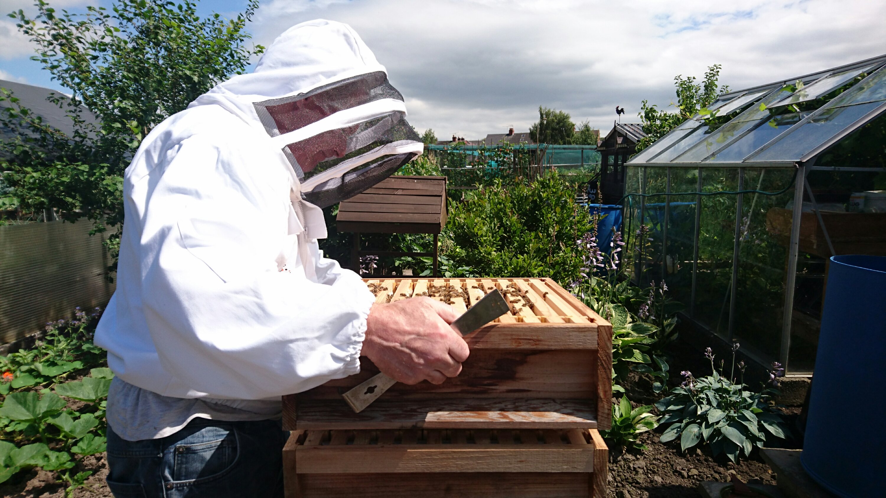 The other hive has grown significantly and we’re more active today. I completed the hive check on my own with Phil and Steve helping to move the heavier brood box and honey supers. Phil and Steve found the Queen in this hive – she is long and a golden orange the entire was down her thorax so easier to spot than the other Queen.