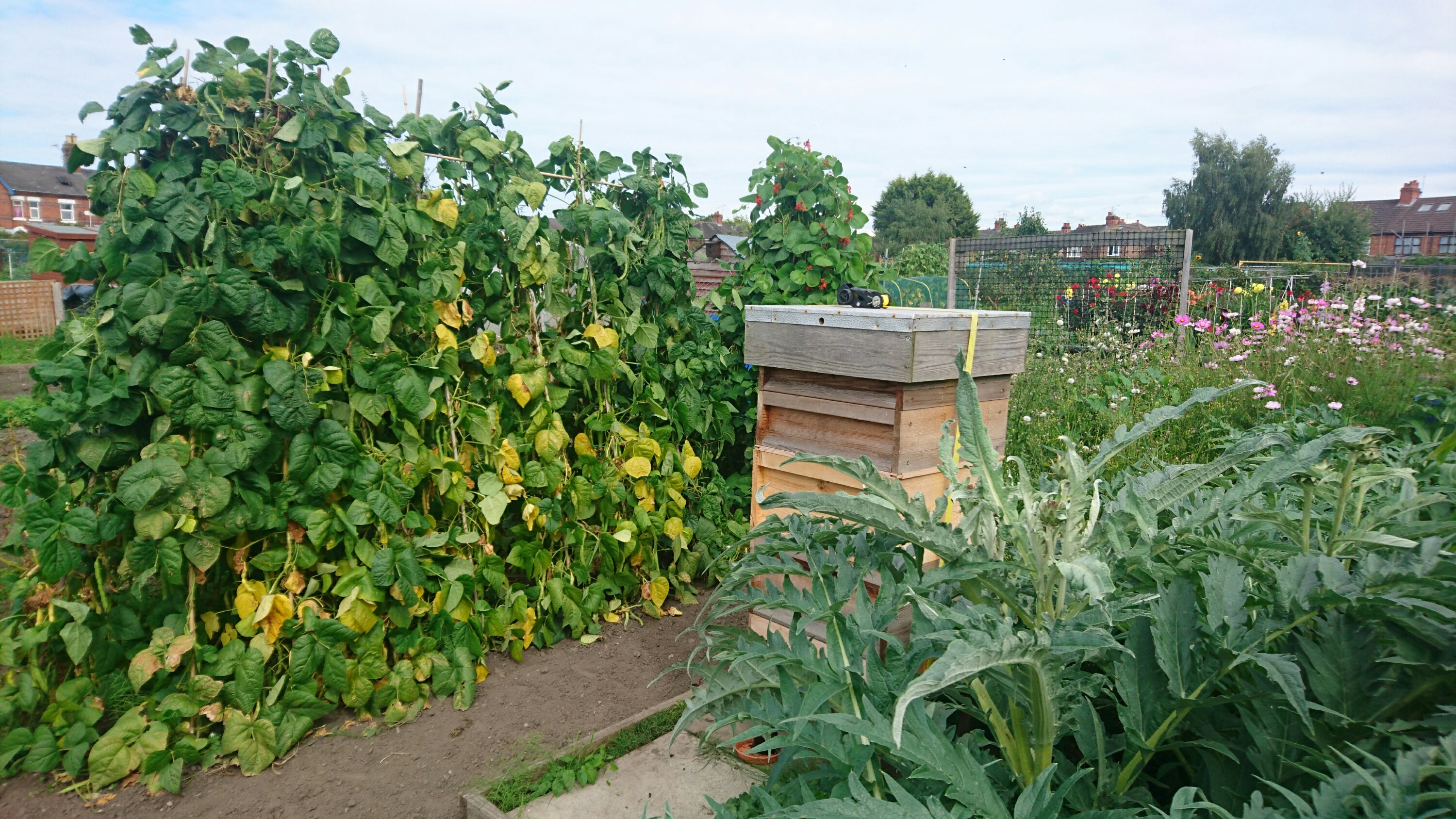 Phil and Steve appeared in the early afternoon to do the bee check. Steve was in charge of the smoker and supervised Phil checking on the first hive. This hive really has settled down and after the mite treatment the newly hatched bees seem to be free of the wing deformities which we saw a couple of weeks ago. We will keep a close eye on this colony for more mites as well as feeding them sugar water over the winter. As an added bonus I even spotted the Queen! We have only ever found her once before and it was weeks ago. The fundamental issue is trying to find a large black bee in about 10,000 black bees….