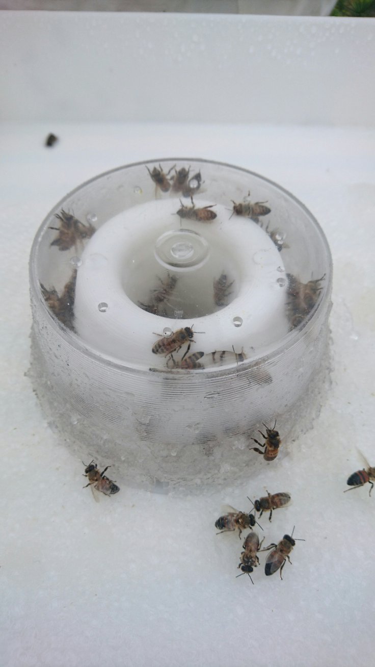 We removed the feeder now after two weeks. The feeder fills a super and is designed to allow the bees access to the sugar water without drowning (which they are liable to do in any water body). The sugar water is made by mixing sugar into water at a ratio of 2:1. Each feeder holds 5l and each hive has gone through 10l of sugar water!