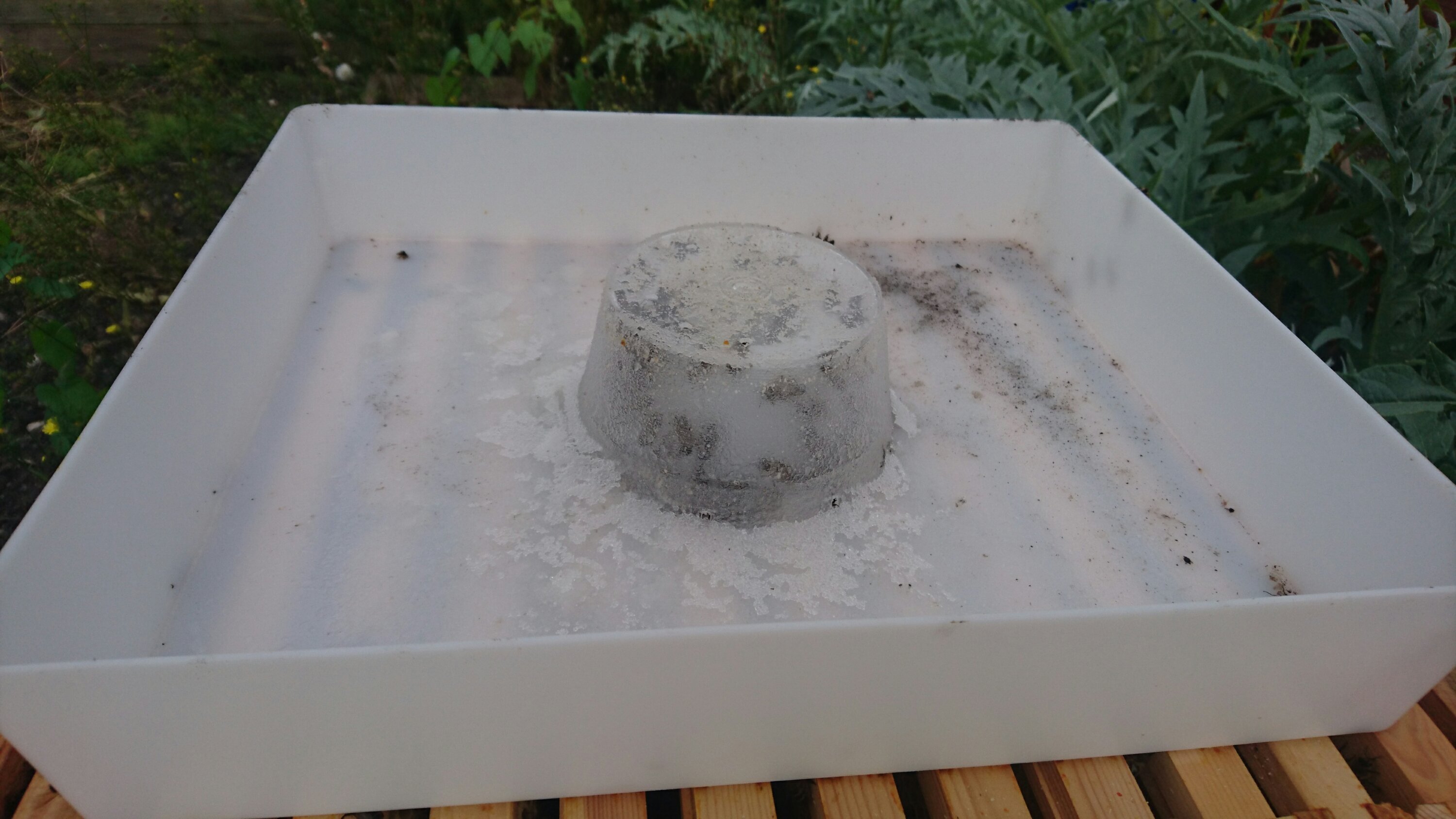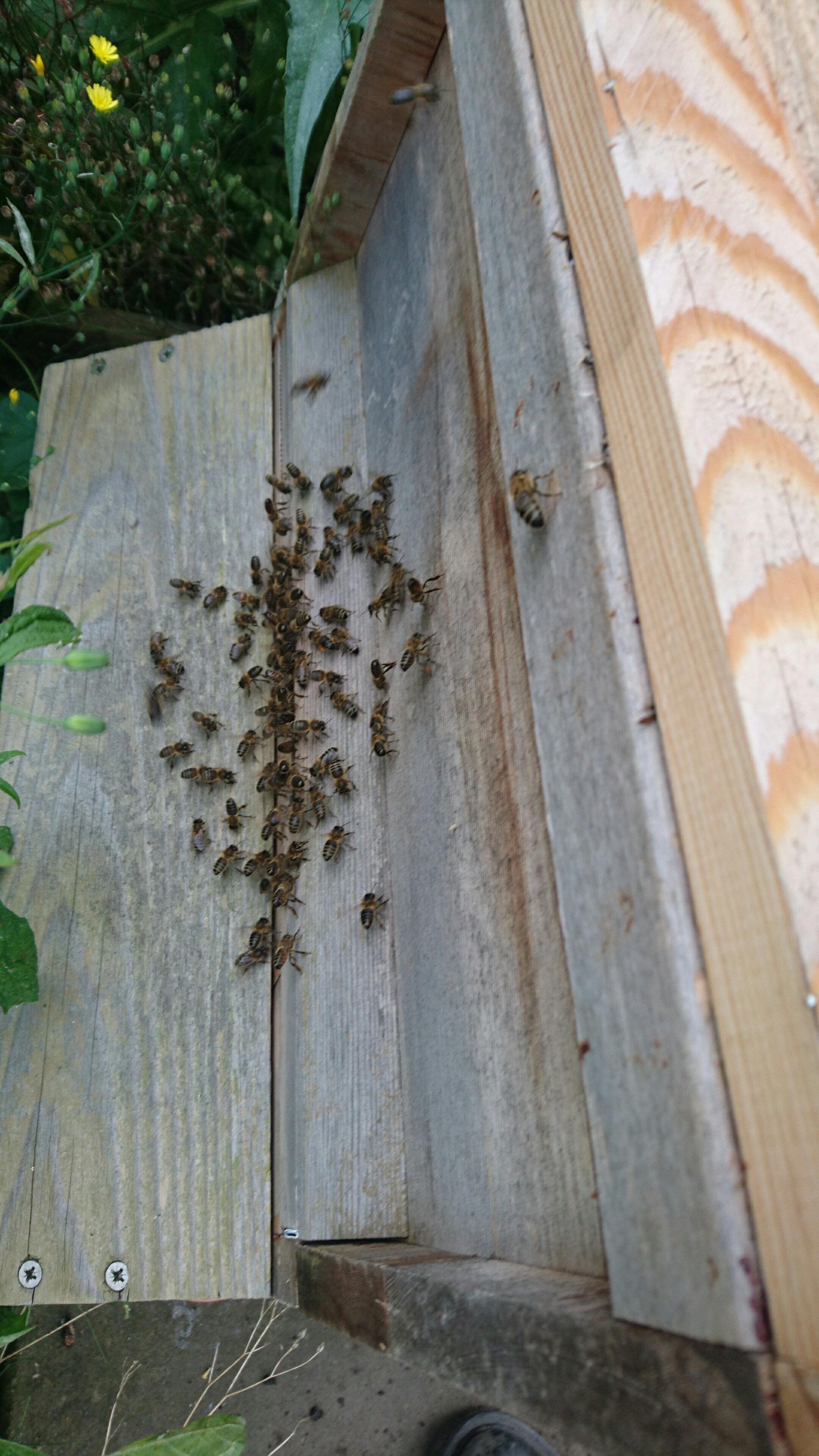 We removed the feeder now after two weeks. The feeder fills a super and is designed to allow the bees access to the sugar water without drowning (which they are liable to do in any water body). The sugar water is made by mixing sugar into water at a ratio of 2:1. Each feeder holds 5l and each hive has gone through 10l of sugar water!