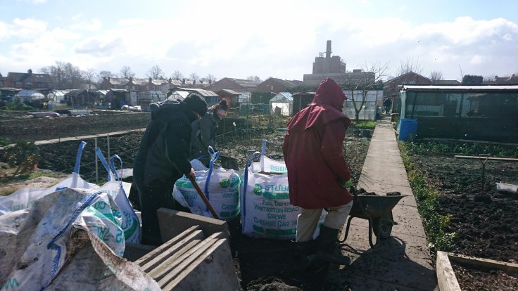 We had strong snow showers intermittently all morning which only partially interfered with the huge works on the community garden. Today’s task was moving 5 bags of topsoil from the main gate to the plot to fill in raised flower beds and boxes. Cliff, Geoff, Steve, Will, Mel, Phil and myself all pitched in and within a relatively short time managed to move nearly 3 bags worth to the plot. The rest will be moved tomorrow and during next week.