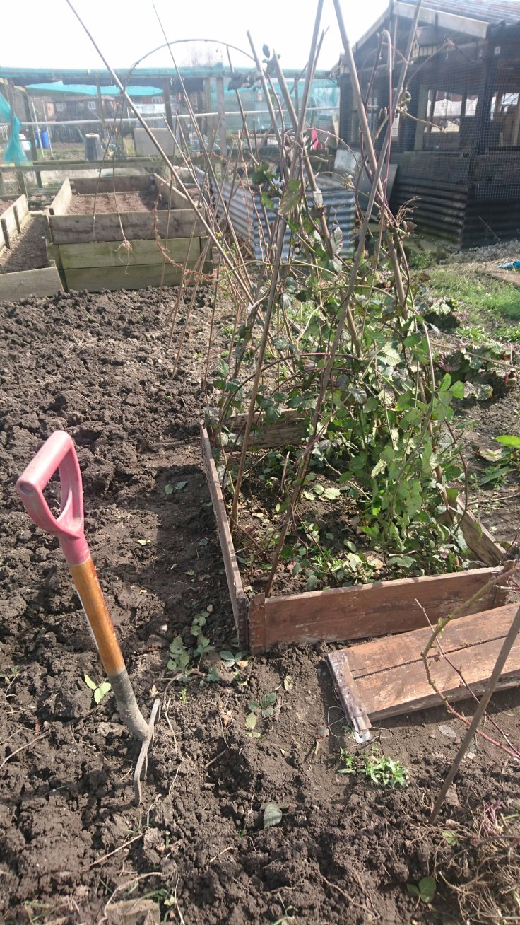 We stopped for a tea break part way through and returned to digging with renewed vigor. My husband finished hit alloted digging whilst I dragged out the raised bed boxes and sorted out the blackberry and raspberry bushes. These lovely fruit bushes have decided to go awol and intertwine dreadfully with the tayberry.