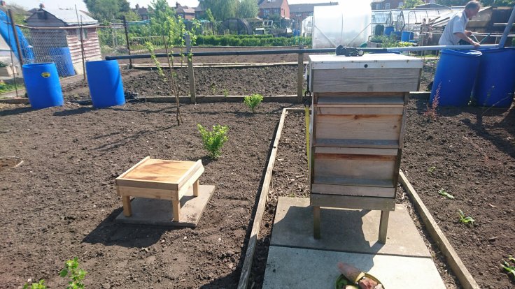 This is the new hive base placed 2-3 feet away. The next stage is to place the nuc box on top and add in the glucose food supply. The inside of the nuc box is designed to replicate a hive.