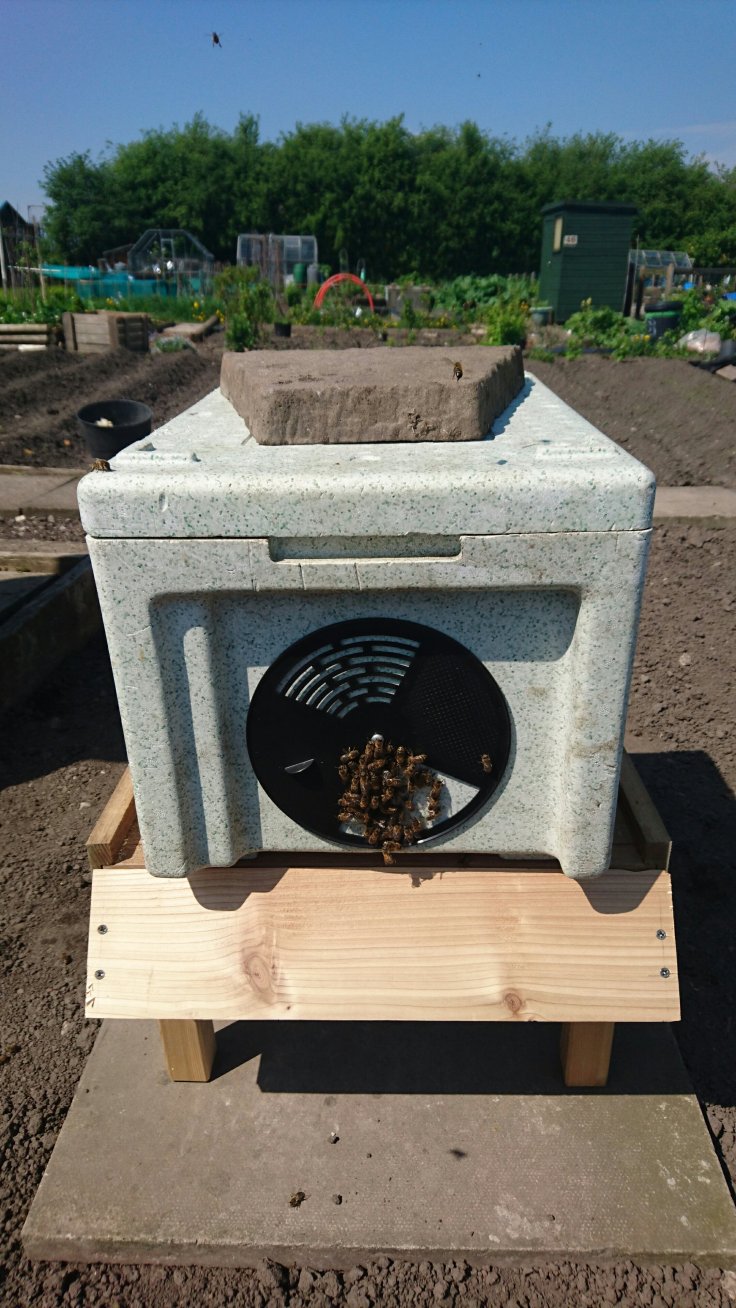 The idea is that the newly hatched eggs will stay in the hive with workers to care for them. The workers will work out the Queen isn’t present in the box and they will convert one of the eggs into a Queen cell. Many of the bees will leave the nuc box and go back to the main hive. But hopefully enough will remain to start the new hive!