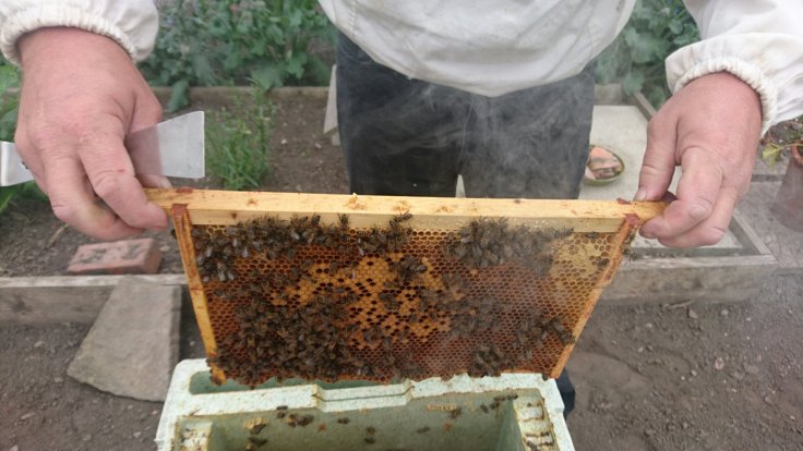Upon refilling the smoker, we ambled across to the other hive near Phil’s shed. This is the hive that had a difficult winter and has been struggling. There was minimal brood of any type unfortunately which means the colony isn’t out of the woods yet. The Queen showed herself and she seemed busier than last time which was good. I guess we will have to wait and see!