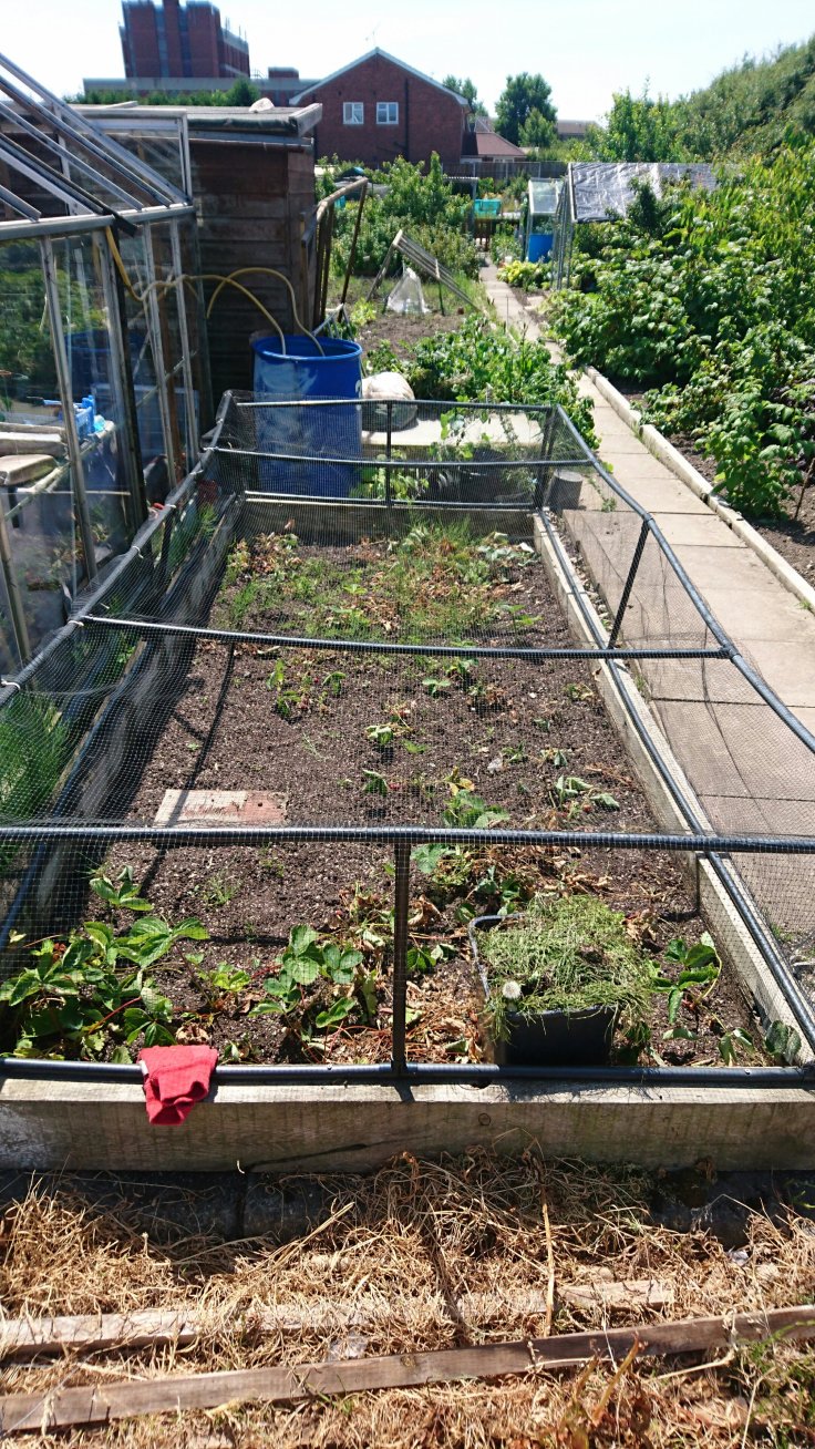 With the heat getting to me, I was beating a hasty retreat home when I bumped into Steve. He was in a rush so the bee check will be done another day. Before I left I remembered to take a photo of the strawberry bed which o weeded yesterday – it doesn’t look too bad!