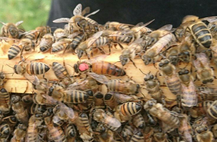 We checked each hive in turn, checking for Queen cells, eggs and the Queen herself. It was the first time I have seen the new Queens that Steve and Phil bought and put into the struggling hives. Each new Queen has a red dot on her back and it makes it so much easier to spot her!