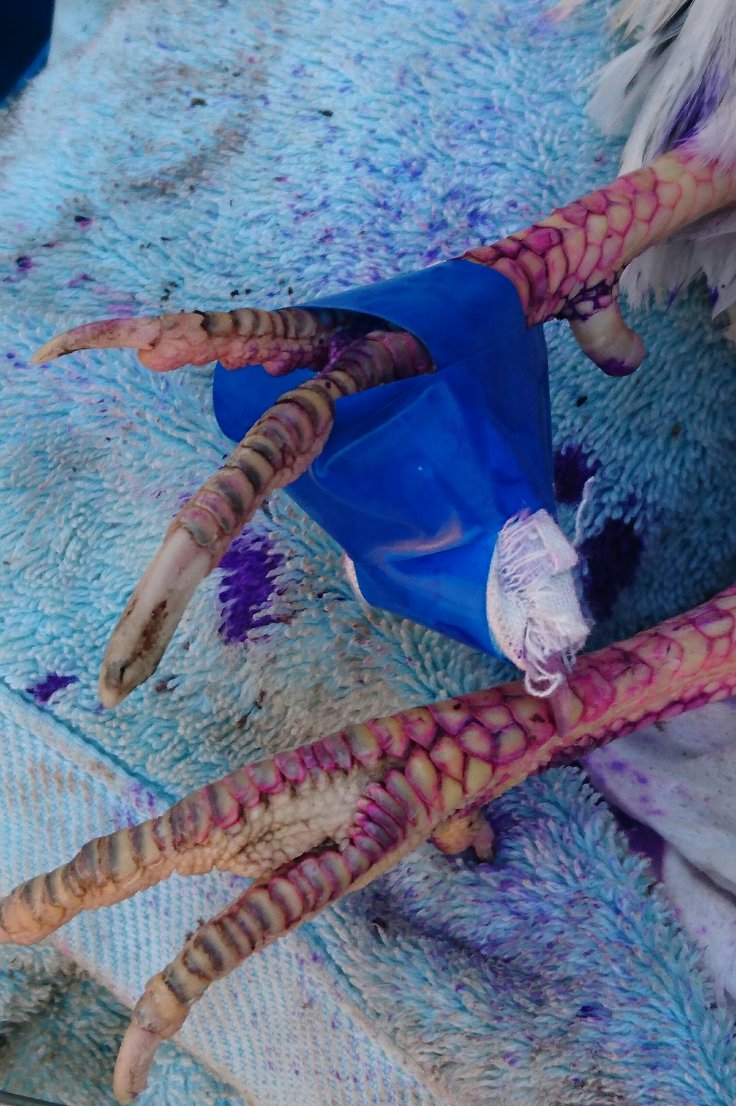 The procedure was repeated for the other foot before each foot was bandaged to keep any dirt from getting into the wound. Geoff took her back to the coop where she took a few minutes to get used to her new blue and purple boots.