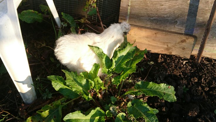 As I was about to leave, I spotted Cliff’s beautiful silky chicken wandering around the back of his coop. I slowly stalked the chicken, determined to catch it on the first attempt. Unlike Molly and her legendary break for freedom into the park, Cliff’s silky is very tame and friendly. I caught her easily and put her in the greenhouse on Keith’s plot.