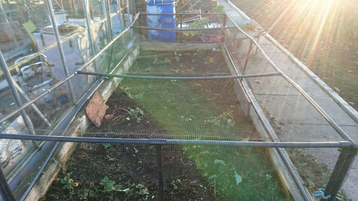 Greenhouses are an excellent place for chickens in winter as the temperature inside is usually considerably warmer than outside. It’s especially important for older chickens or breeds susceptible to the cold, like silky’s. I topped up her water bowl and put out a mix of food to keep her going overnight. Cliff has left a cage full of straw to give her somewhere safe and warm to sleep.