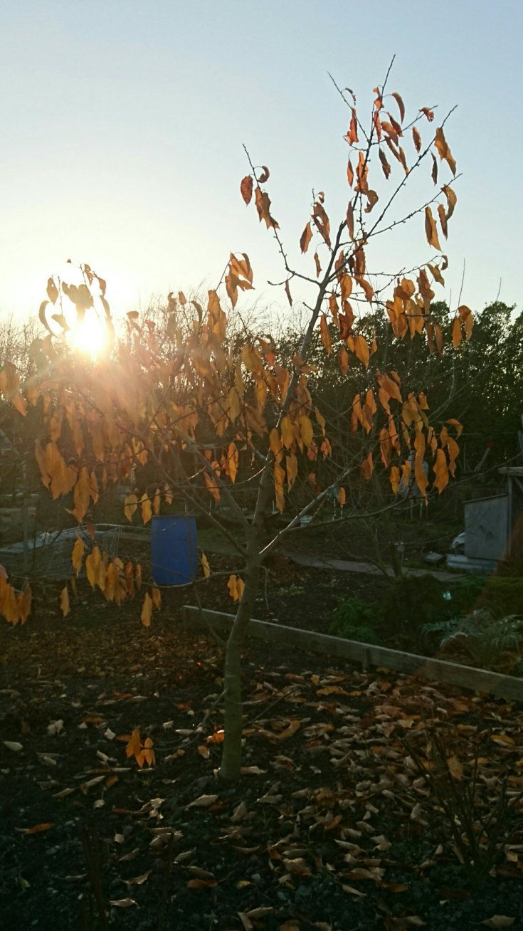Late this morning, I ambled down to the allotment, enjoying the bright autumn sunshine. Although the temperature has dropped, it is warm enough if you keep away from the shade. I love these cool and bright days on site – there are still a few remaining leaves on the trees, bright splashes of vivid yellow and burnt orange against the dark brown of the soil below.