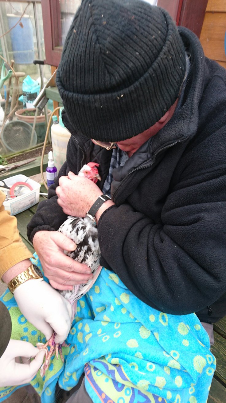 Whilst Geoff put and kept the irate chicken in her Epsom salts foot spa, Cliff prepped all the equipment and bandages. Out she came and we could see how bad her feet were.