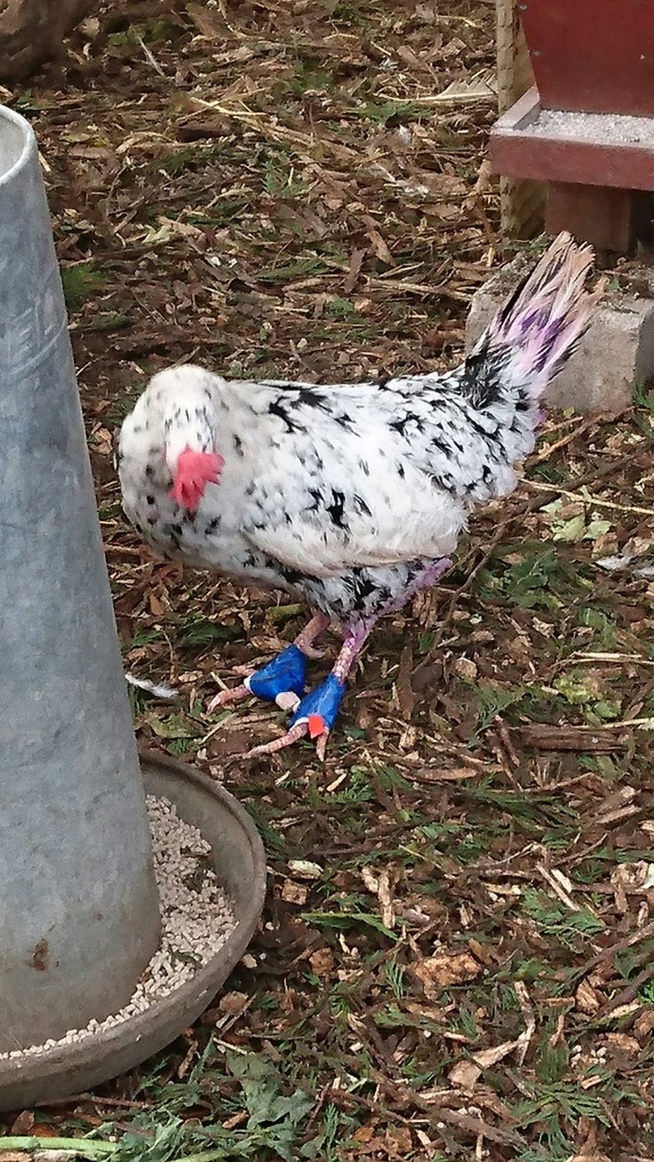 Sadly, it doesn’t paint their feet a vivid shade of purple but it still does the job of killing the infection. Using lots of tapes to secure a bandage on each foot, we took her back to the coop.