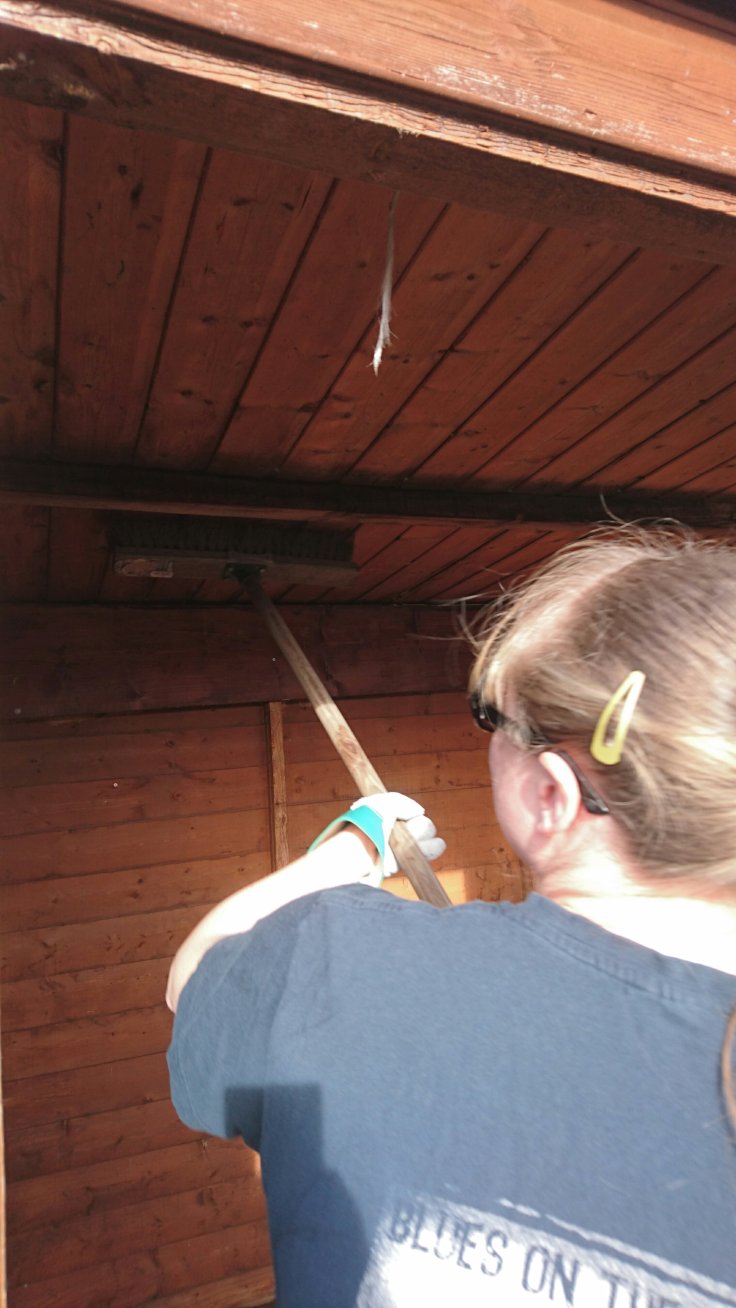 After the first three panels were done and Fiona had done half of the ceiling, the shed was already significantly lighter. As the painting continued, we were able to see more and more of the once dark and pokey corners of the shed. The end of the first paint pot meant that we had to open the second smaller pot which contained a different colour paint called clotted cream. How this is different from Ahoy beats me as they are almost exactly the same colour. As the first coat of paint was now dry, we used the new paint to complete a second coat. The wood is still visible through some area but it give the shed a rustic charm. We rapidly finished the second pot of paint and decided this was a good time to get some fresh air and a drink.