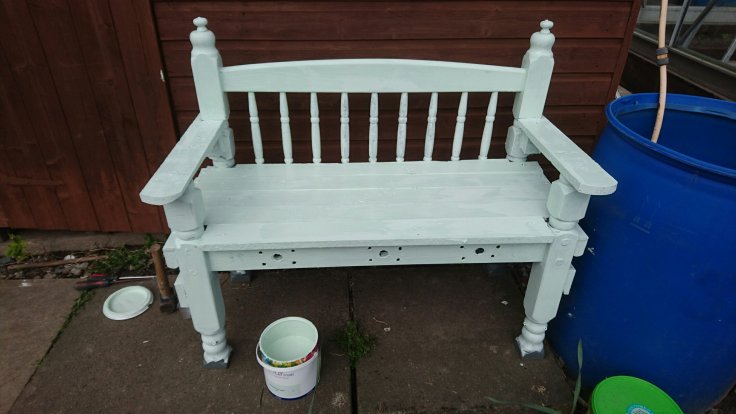 Once the shower finished and the sun came back out, I decided it was time to try to paint the bench. I got out the gorgeous green paint that we upcycled the shed furniture with, and began to paint the bench. With the sun out between the clouds, the paint dried quite quickly. I still have several bits to do but it looks so much better now.