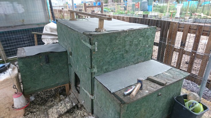 Armed with only a Stanley knife, tacks, a hammer, the felt and a childlike sense of wonder I set off to sort out the coop. I decided the top of the nest box needed two smaller strips and a larger patch on top. Then I used the longer offcut from the shed to cover the side of the smaller nesting box. Fortunately, it was long enough to cover the back and lid. It’s not the neatest job but it will hopefully do until the worst of the rainy weather is over. As a finishing touch, I put the canvass cover over it all. Here’s hoping it works!