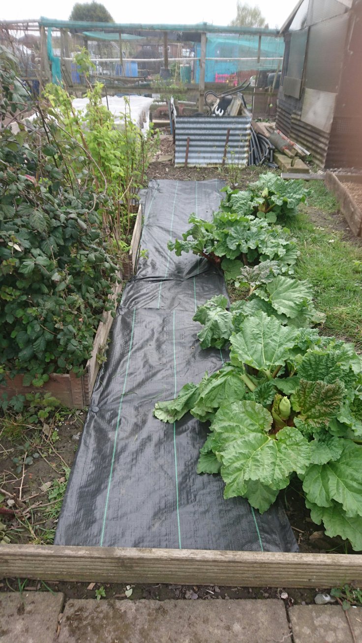 Next, I took the wheelbarrow and fork up to the main gate and trundled back and forwards with the bark chippings. I tried to spread the chippings out evenly so that I could cover as much of the fabric as possible. Unfortunately there wasn’t enough to cover all the fabric. Once the bag was less than half full, I dragged it down to the plot and emptied it out around the fruit bushes. It does look rather snazzy though I say so myself.