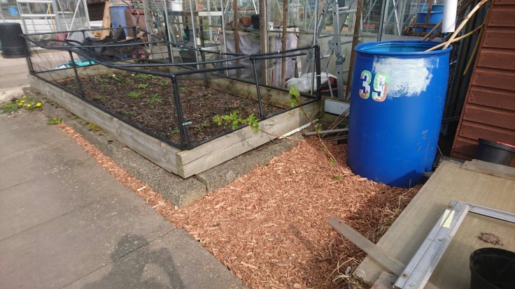 He arrived on time and helped drag the enormously heavy bag onto the bottom of Keith’s plot. I paid him off, grabbed a fork and a wheelbarrow and made a start. My first job was to top up the bark by the side of the shed. I originally laid weed fabric and bark down several years ago. It massively improved the area but over time the bark has compacted and rotted so there isn’t much left. The cedar has a beautiful red colour to it and it certainly brightens up the side of the shed. I carefully wedged the bark between the path and the shed to stop the infernal weeds.