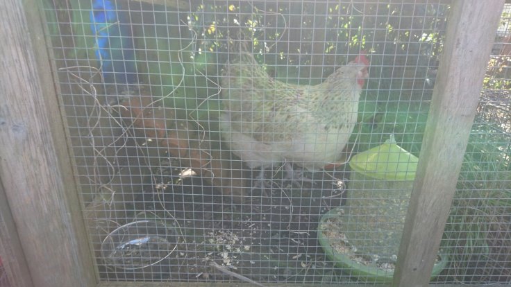 I ambled back to check on the rest of the girls. I found we had forgotten to close the coop door. I dashed in to check that all the girls were there. I counted all but one. Then out of the corner of my eye, I spotted a feathered head. Polly was busy under the fruit trees, quite happy and content. As I went to try and get her back in, I thanked God that it was her and not one of the Vorwerks (see previous post about Molly’s spectacular escape!). I chivved Polly towards the door, forgetting it was now closed. She walked calmly past the door and towards Geoff’s coop. I snuck into the coop and started giving out some sunflower seeds. Luckily, she jumped back through the door in order to get her share!