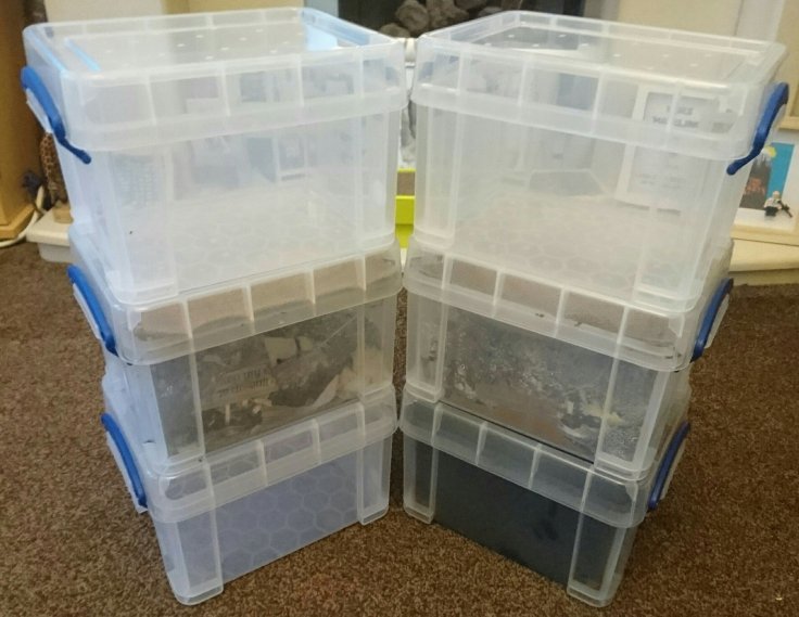 So onto the main job of the day. The plastic boxes I had bought were clear but the worms need darkness as they are photosensitive. Trying to be clever, I had bought some black paint to paint the inside of the boxes. I waited in the freezing cold whilst they dried.