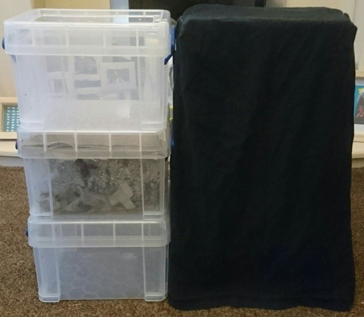Absolutely! I found the plastic boxes discounted and rummaged around for the filling for the tower (newspaper, cardboard, kitchen scraps).