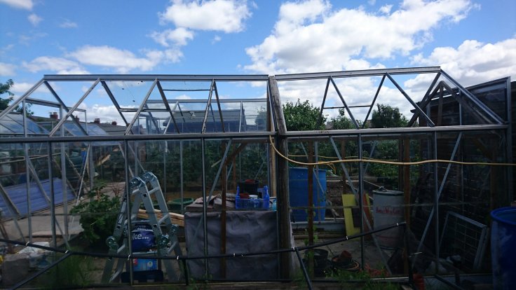 Cliff swung by to share an idea about fixing our greenhouse. As it is two greenhouses joined together with a wooden frame. Over time the wooden frame as started to rot and the weight of the glass started to make the situation worse. We removed the glass several months ago and Mick the Greek had secured one side with additional wood and a strong bolt. Whilst this has kept the structure from falling, it hasn’t fixed the fundamental problem. Cliff’s idea is to remove the shorter back section and use the spare parts from it to fix up the larger front section. The removal of the back section of the greenhouse would give us a reasonably large space between the shed and the back of the shortened greenhouse. As the entirety of the greenhouse is paved, it would give us a patio area to relax in. I discussed this idea with my long suffering husband who agreed saving part of the greenhouse was a good idea and that if the greenhouse was smaller we could use the space more productively for growing crops.