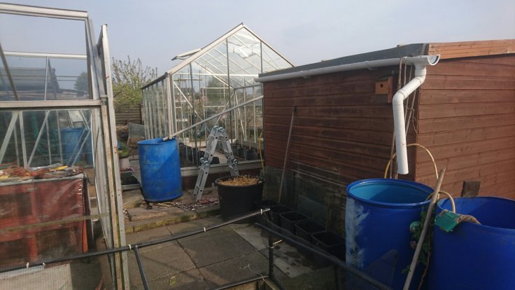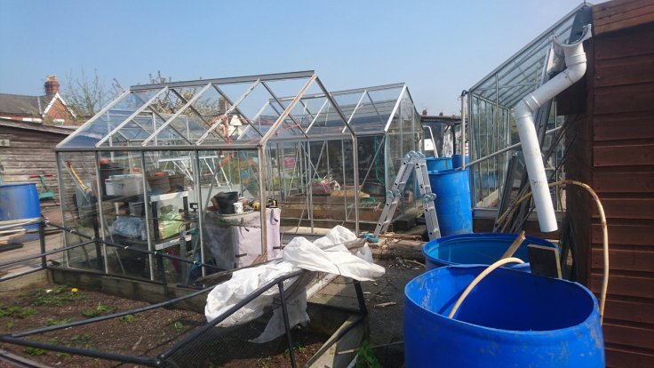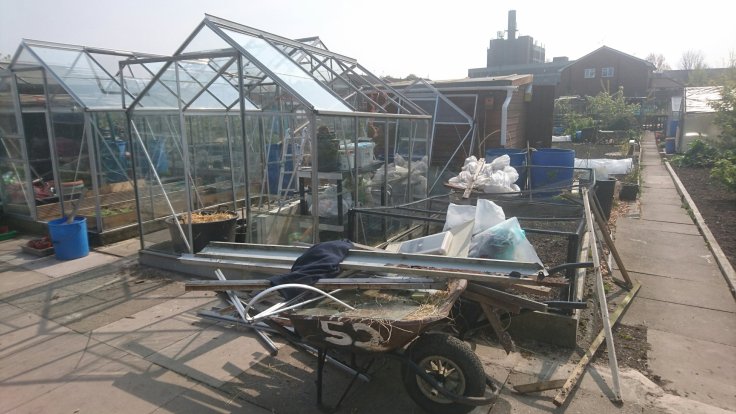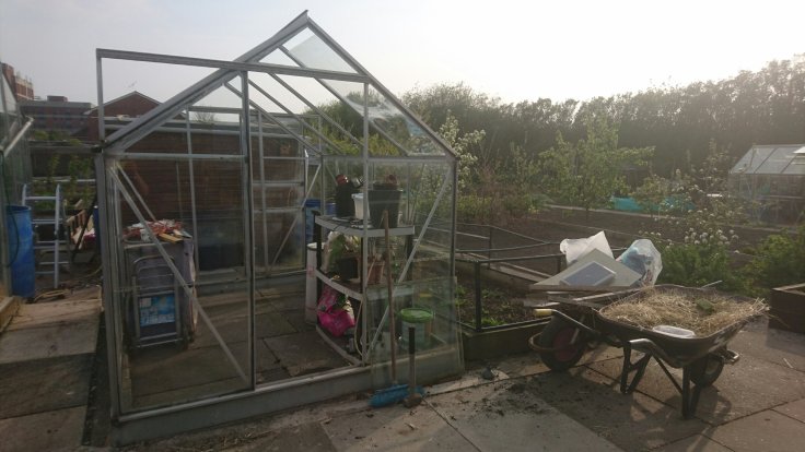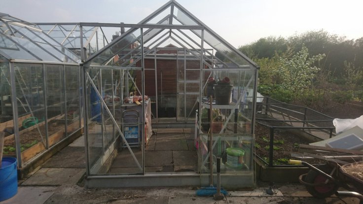 We walked back to check on the greenhouse and I realised we had forgotten to bring down the greenhouse clips I had bought yesterday. We dashed home to get them and popped to the shop to get some food for lunch. Whilst lunch was cooking at home, I dashed back to the allotment to find the back of the greenhouse had been totally removed. It was possible to see how much room we would have on the patio area and how enormous the greenhouse still is!
