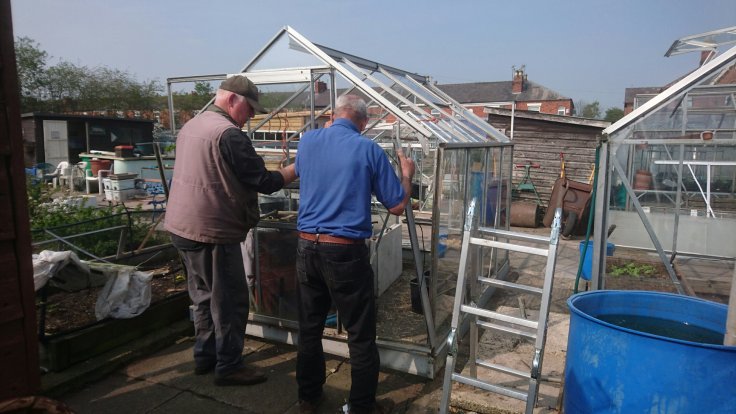 I got called home for lunch which I scoffed in the garden before heading back once more. Upon my arrival, Cliff and Mick were in the process of attaching the back panel of the greenhouse. As it turned out, the back section of the greenhouse was a slightly different width to the front part. This made fixing the back door to the front frame difficult. On top of this, the front greenhouse frame had bent slightly out-of shape over the years and the holes for the bolts stubbornly refused to align. Quickly, I volunteered to pass tools, hold bolts and screw on nuts as Cliff and Mick successfully attached the back door. The removal of the back end of the greenhouse meant we could reuse the glass, bolts and nuts to repair the front section of the greenhouse without having to buy new glass or bolts. Both Cliff and Mick have worked their magic on it, it looks amazing!