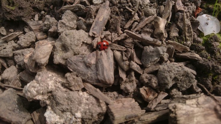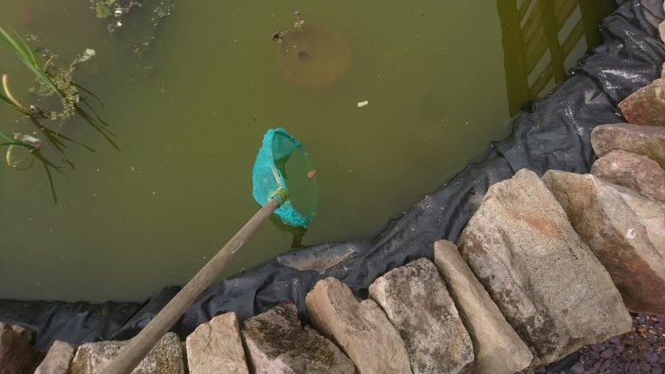 Shortly after I finished clearing the pond, Cliff arrived. I showed him the net and we set about removing a large submerged pot from the pond. It had previously had reeds growing in it but nothing was coming up and what remained looked very dead. As we took the pot out, I spotted movement. It looked like a dragonfly larvae! We quickly put it back with some mud into a smaller pot and dropped it back into the pond.
