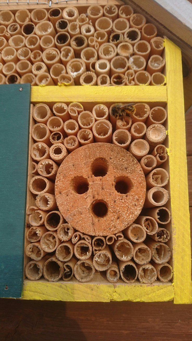 As was packing up the shed, I heard a buzzing. I spotted several bees around our bug hotel. I spent several minutes watching the bees go in and out of the holes in the hotel. I have tried to catch it on video but it was difficult to get the fine detail either on the video or in the photographs.