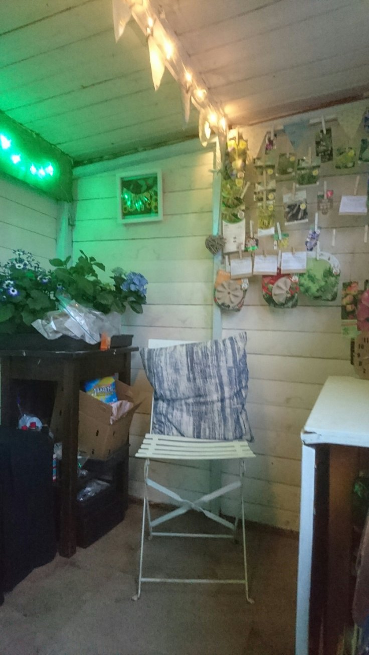 Before we left, we checked on the pond in the hope of spotting the karp. She was determined not to show herself and we gave up and left. Just as we were about to walk off site, I remembered I had forgotten to lock up the shed and water the potatoes. We walked back to lock the shed and I took the opportunity to show off the lighting which looks great in the dark.