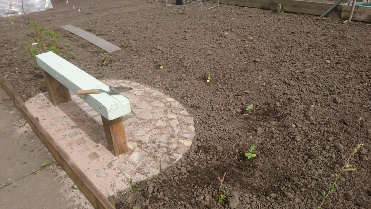 With the plot cleared of weeds, I moved on to plant three short rows of fennel between the apple tree and the new bench. Both the white bulb and the green leaves are edible. The soil needs to be built up around the bulb in a similar way to potatoes. Let’s hope we get a few to try!