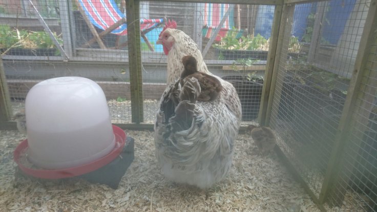 Emily is frazzled with all three chicks. The chicks are growing massively and their secondary feathers are coming through. Currently, their feathers are growing on the wings, shoulders and a hint of some tail feathers. The wyandottes are still enjoying climbing on Emily’s back, much to her eternal disgust. They are given short thrift and deposited back on the ground.