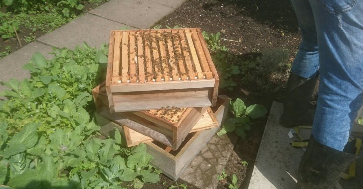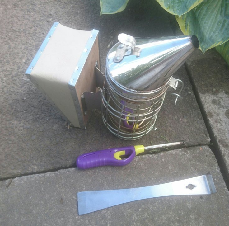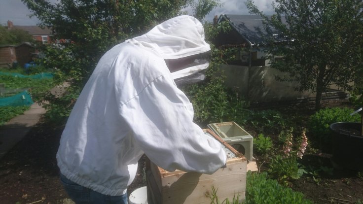 We made a start by cleaning out the nuc box and collecting frames to replace the ones we would be taking out to go into the new hive. Bee suits on and the smoker lit, we opened up the big hive on Phil’s plot. Considering we split this hive mere weeks ago, it was massive. Both supers were full of honey and weighed an absolute ton.