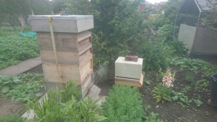 Today, Steve and I checked on the new hive. It was hardly ideal weather as it was quite windy with rain showers, two things that bees absolutely hate. Added to this, we couldn’t find the bee suits after Phil had taken them home to wash a couple of days ago.